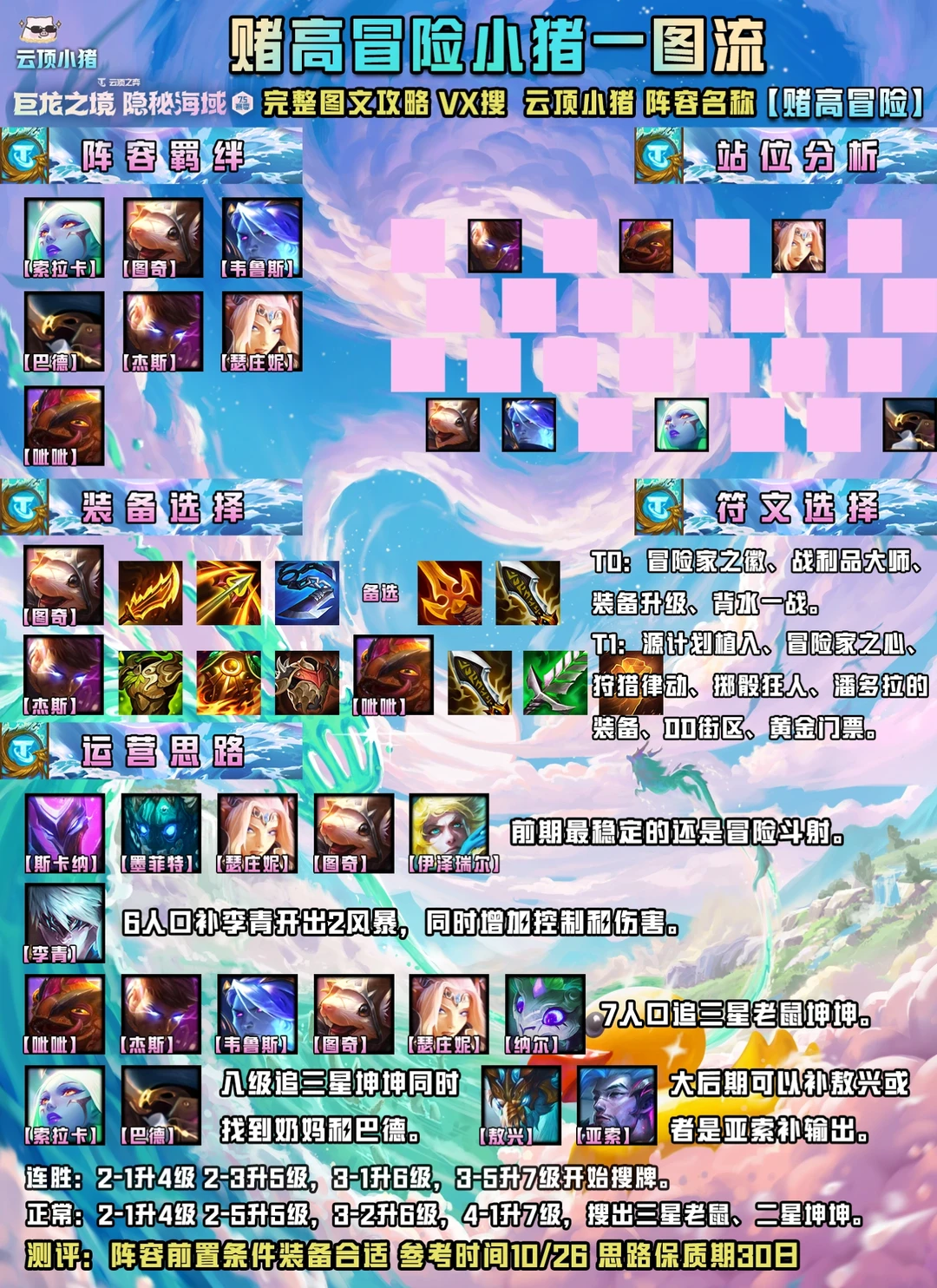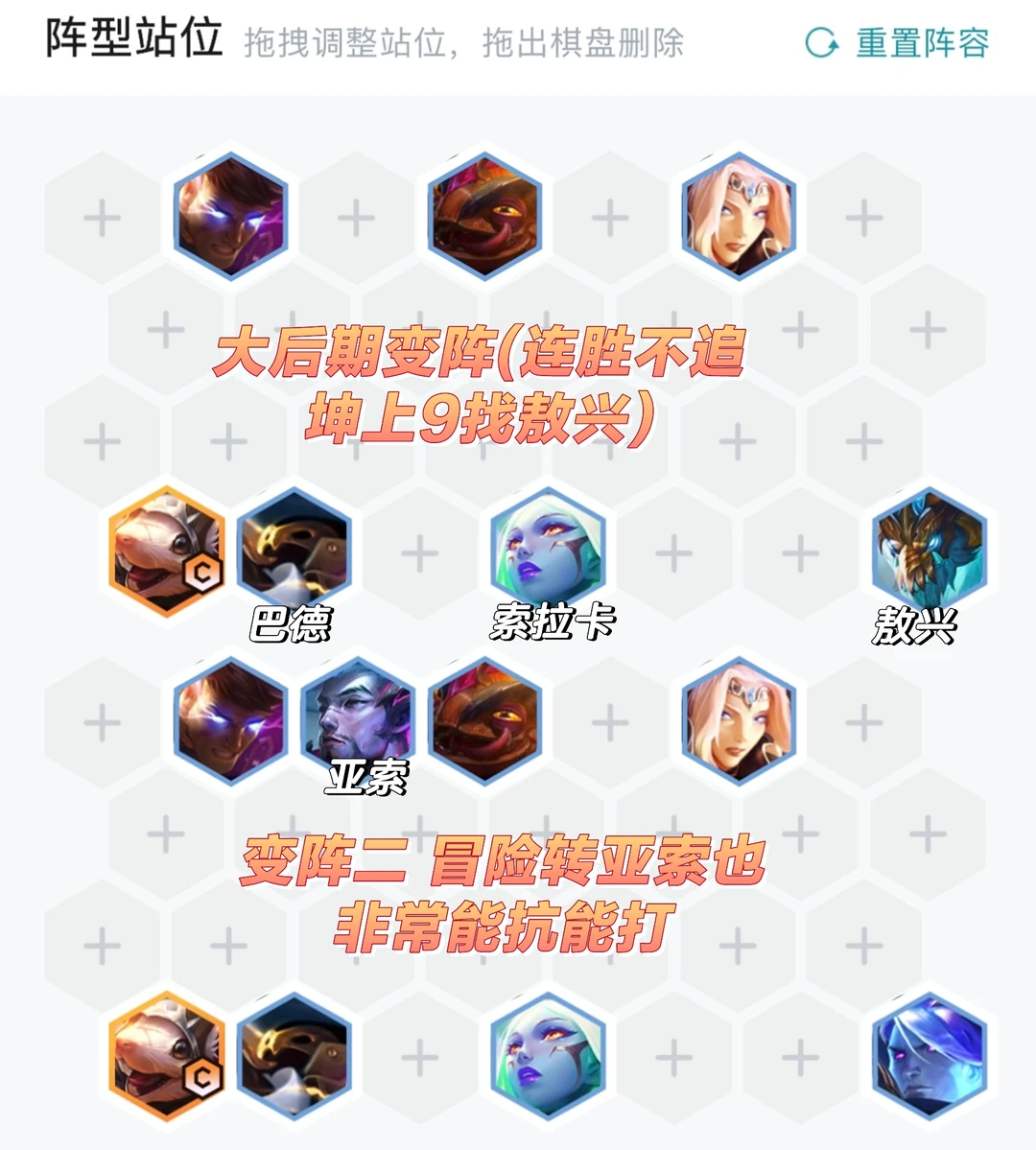 这套阵容没有同行只是怕装备不对,因为装备差3星也锁不住血就很尴尬,所以有冒险符文或者装备对的情况再玩,后期变阵比较多需要一定得熟练度做支撑。
