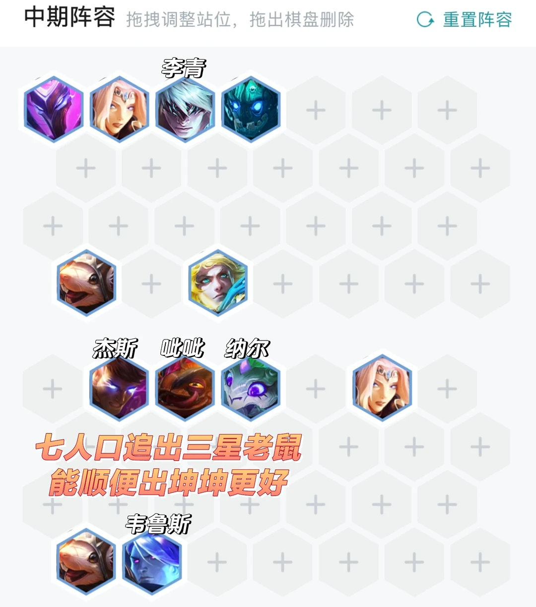 6人口不容易出杰斯,所以一般7人口追老鼠和呲呲,这两张都是冷门卡所以也不用抢牌,有玩其他2、3费的赌狗更好,可以帮你卡一下卡池,更容易出三星。