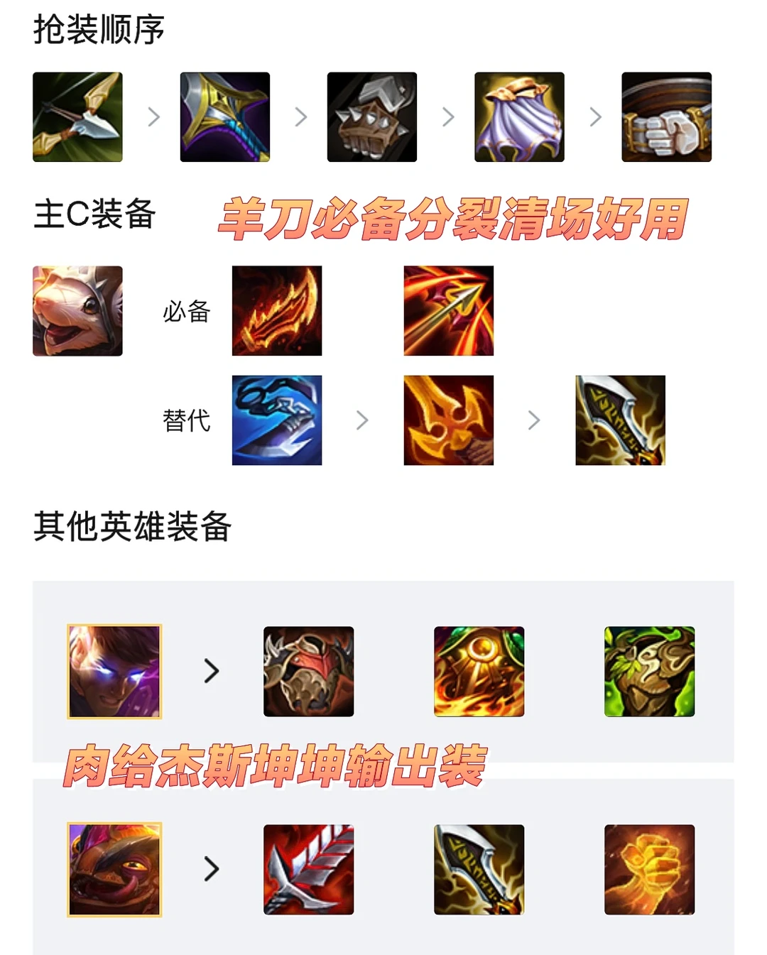 装备思路:优先做出羊刀分裂剑很容易打连胜,杰斯和呲呲的装备都尽量找到两件及以上,装备偏差越小越容易锁血,尽量不要给杰斯和呲呲偷偷,这样会少很多战斗力。