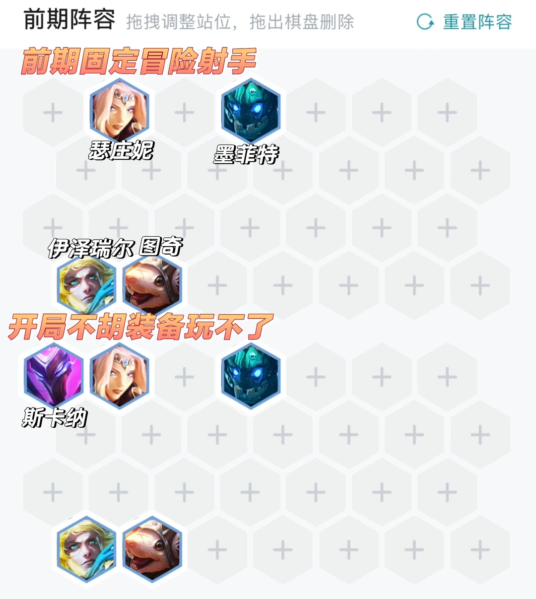 前期还是冒险斗射最舒服,即能连胜也能只拿体系牌后面变阵方便,经济也不会差,没有体系牌可以根据二星怪灵活搭配一些棋子也行。