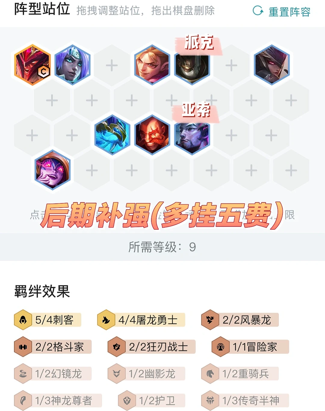 刺客放第一排,其他怪放后面可以稍微拉一下怪,奥拉夫和皎月最好是一左一右,这样双保险不会跳空,男刀固定中间。基本就左右换皎月拉夫位置就行了。