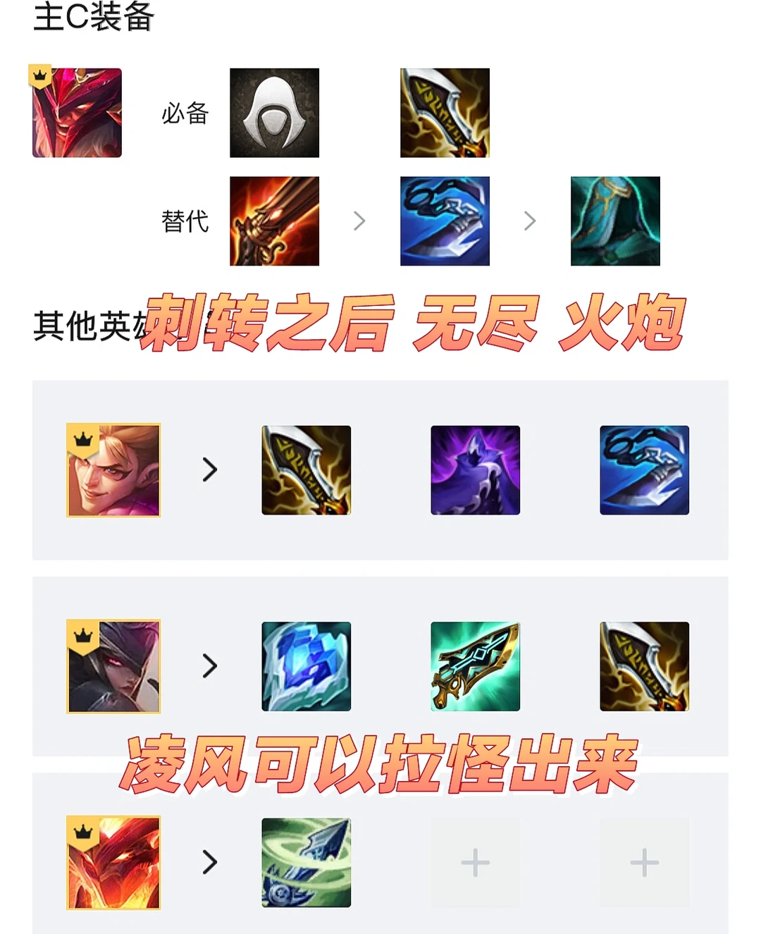 刺转是核心,拉夫有没有刺转是T0和T1.5的区别。其次推荐火炮无尽最佳,不需要吸血。多余输出优先给皎月,功能装做一个冰心,中后期会厉害很多,多余肉装给到布隆或者慎(看谁3星)。