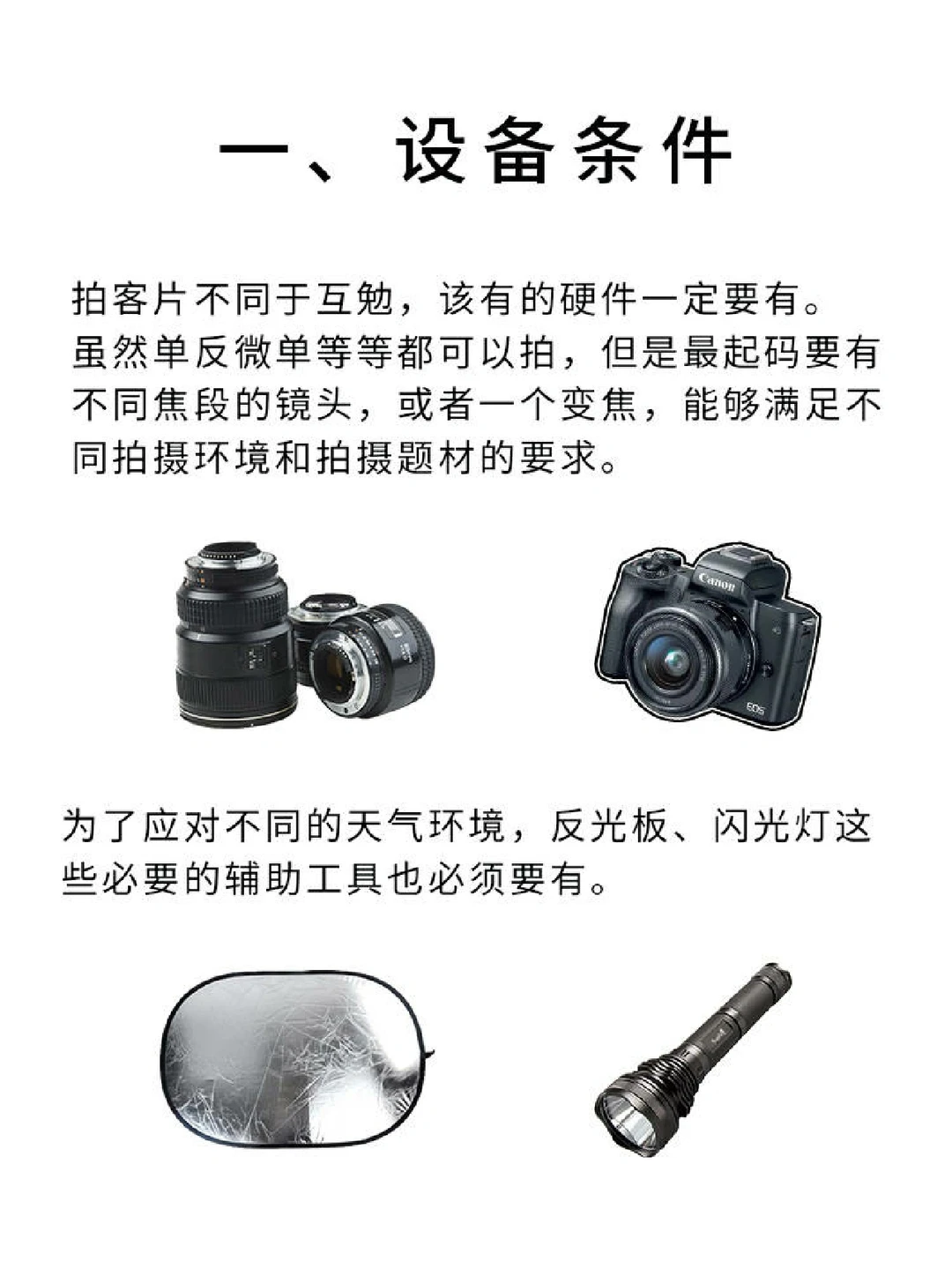 👉🏻拍客片首先硬件条件要跟上,相机、镜头、反光板、补光灯一定要有。