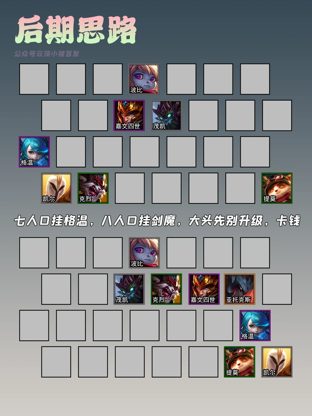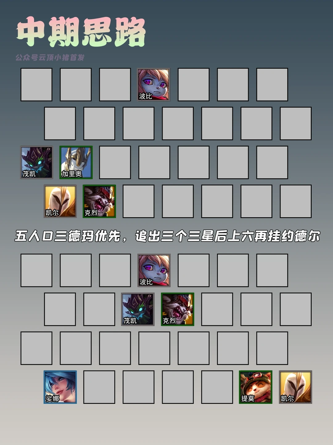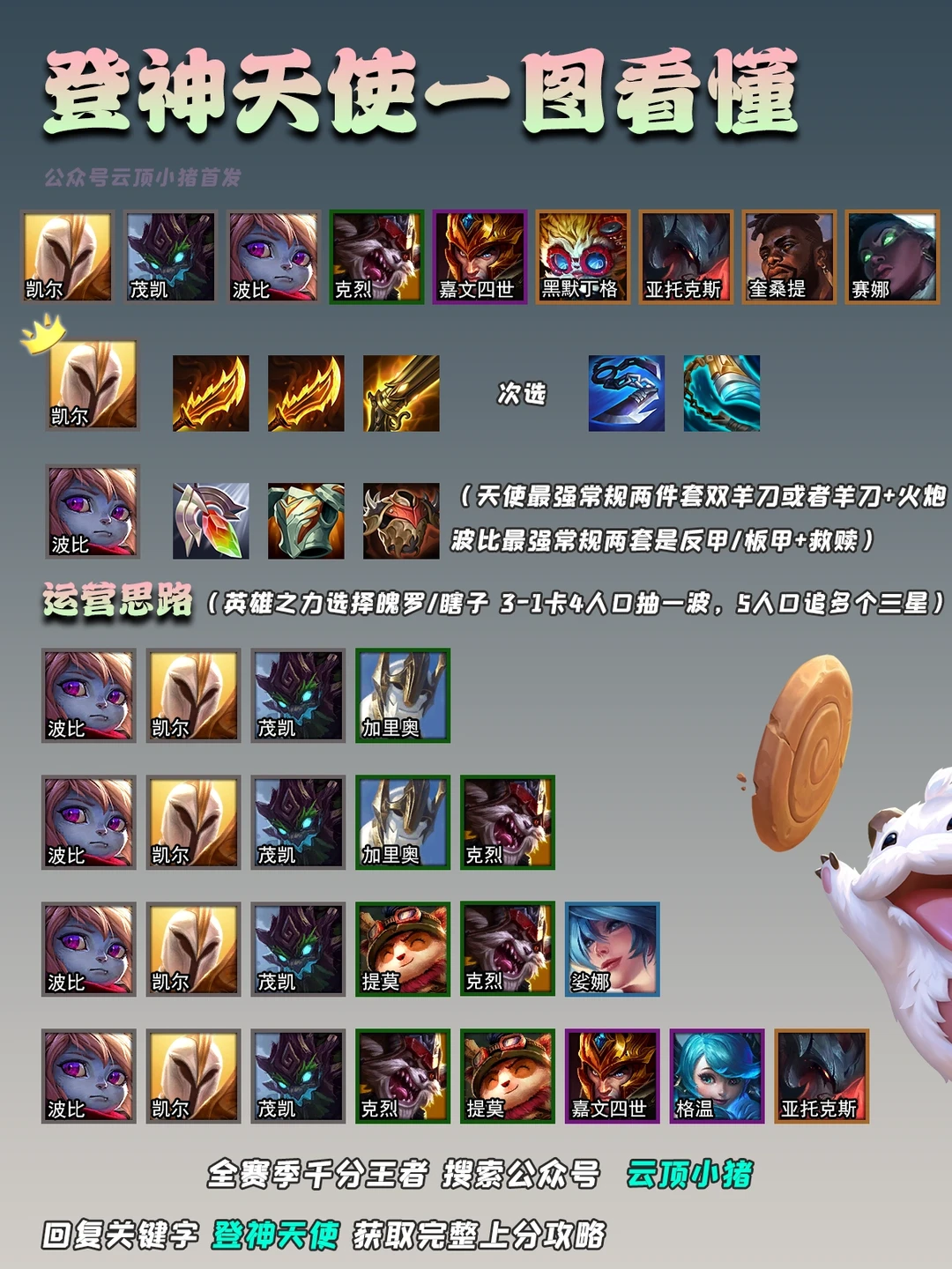 装备思路:天使和波比必有人吃德玛西亚光明装备,无论是谁其实都行,这里我们先保证常规两件套,天使胜率最高的时羊刀+羊刀或者羊刀+火炮,波比则是救赎+反甲/板甲,光装备谁吃都行,主要看场上掉落情况,最好是3+3都能合理满装。