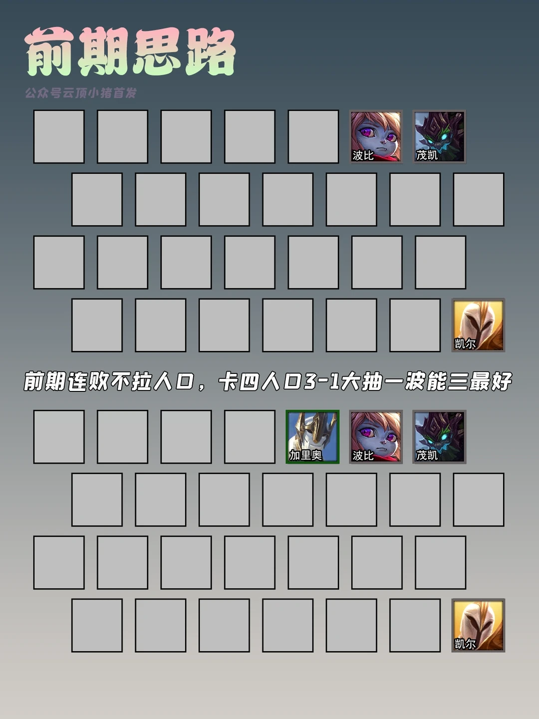 3-1卡4级大搜一波,如果嫖的很顺,可以考虑直接梭哈追出1-2个三星,五人口三个三星后上6,然后开始存钱拉人口。