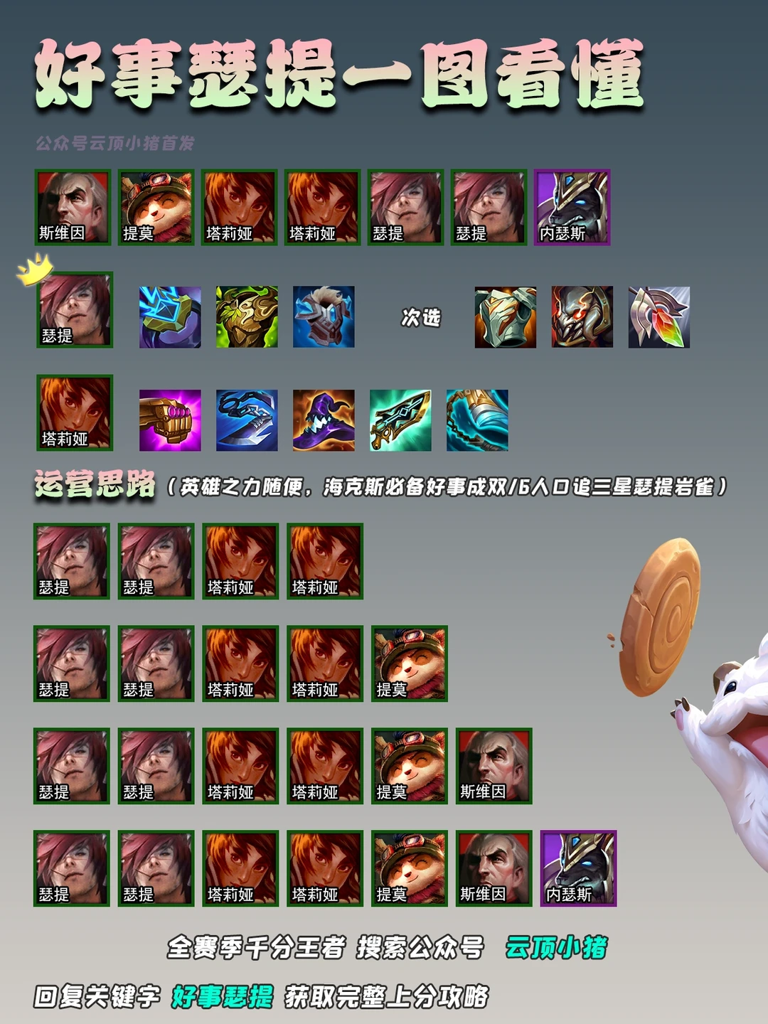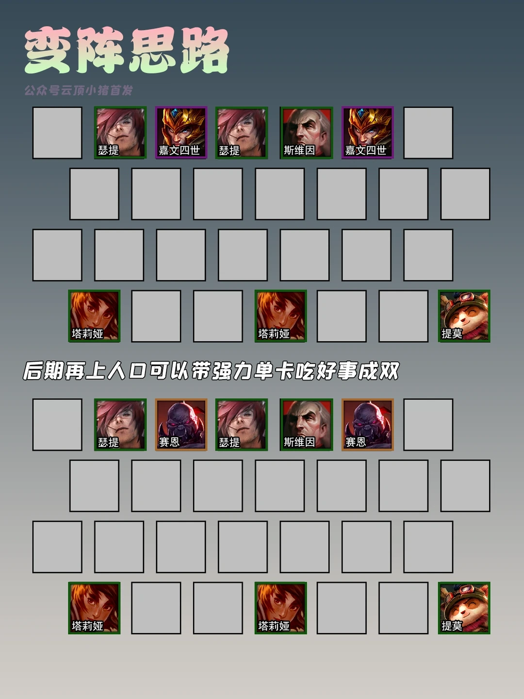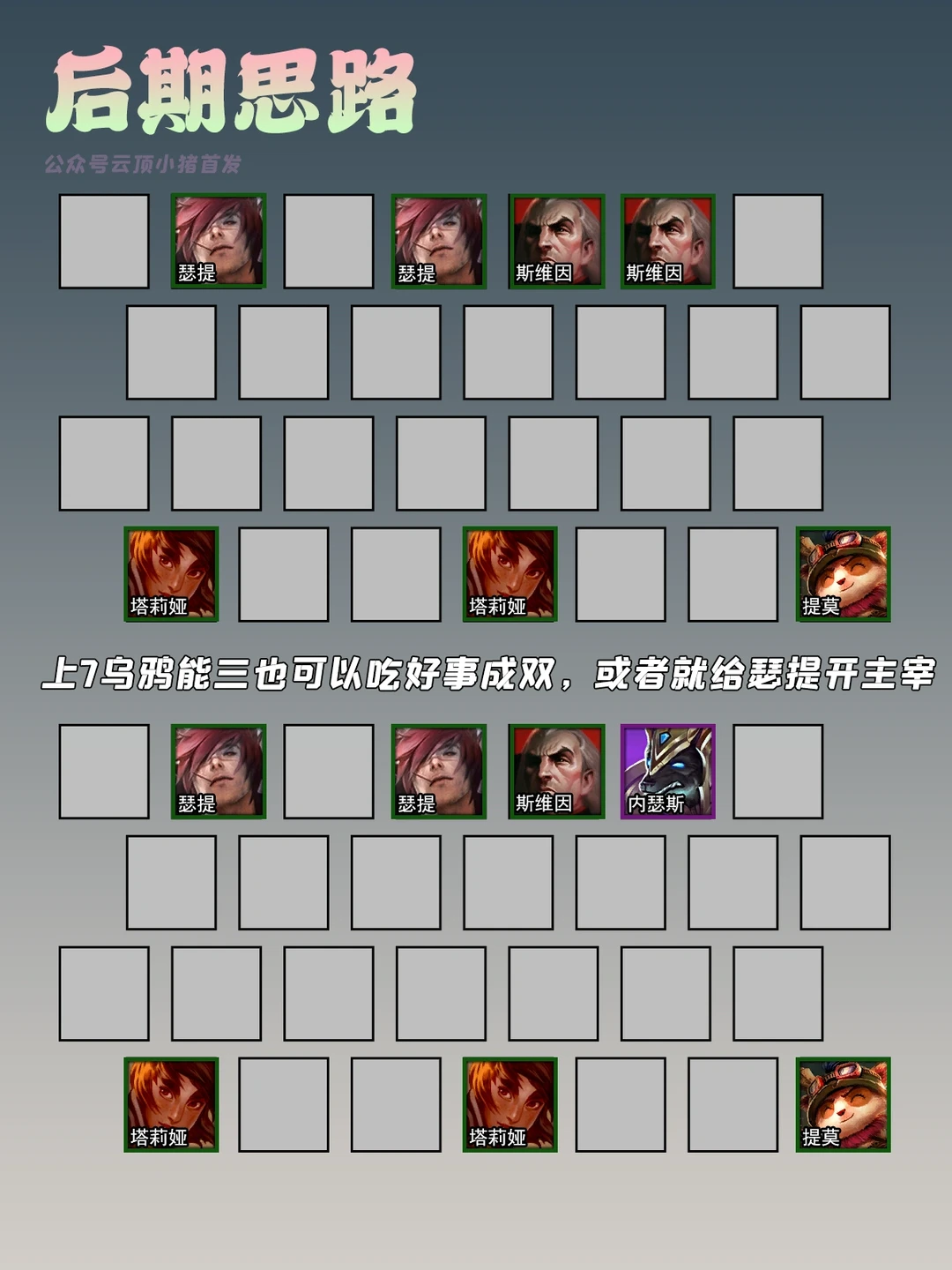 3、后期可以带高强度单卡,8人口补两个皇子、老司机这样的都OK,乌鸦和提莫没必须吃好事,浪费。