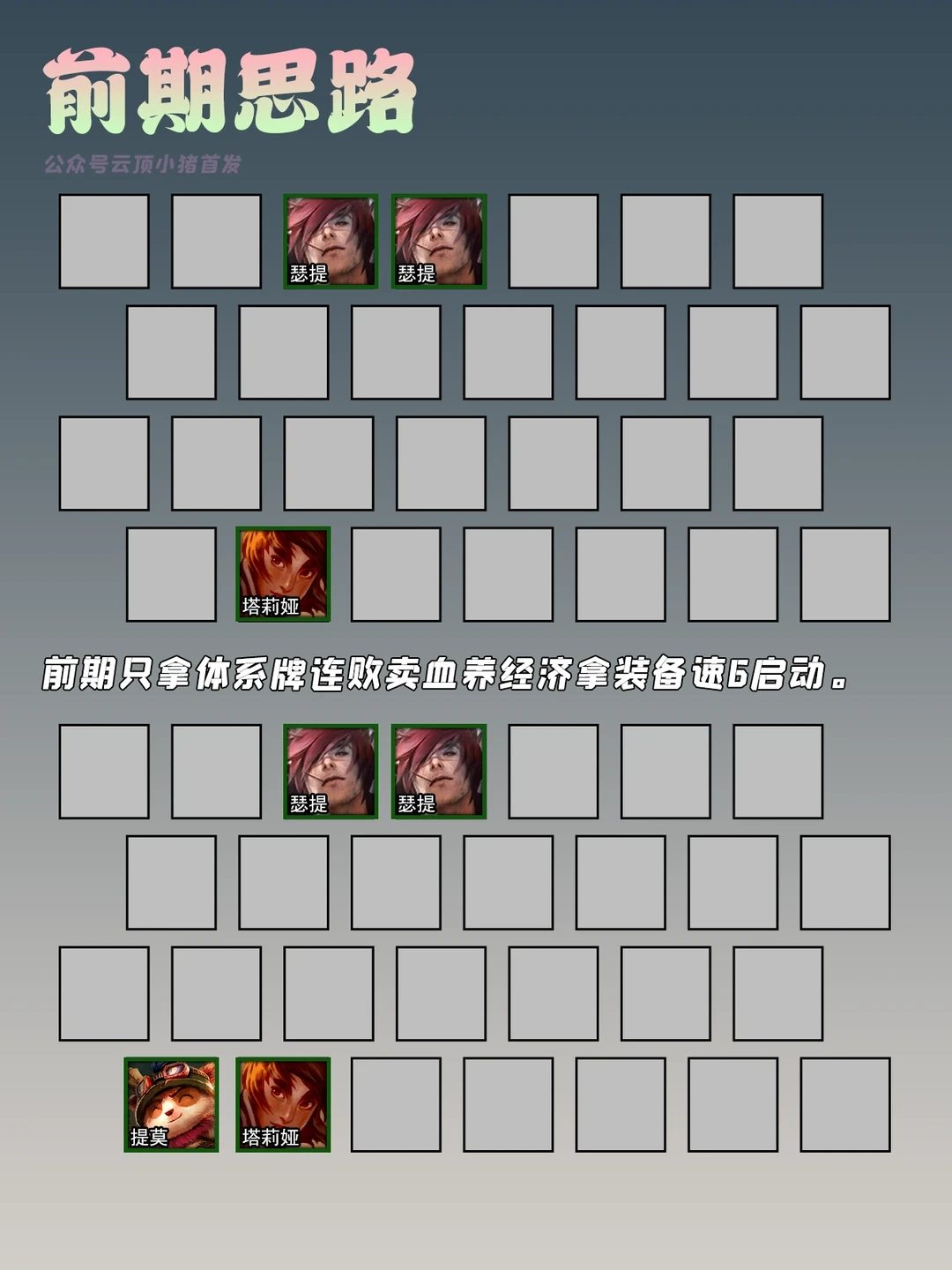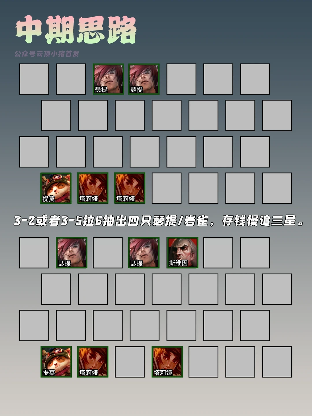前期如果嫖牌一般就不拉人口走连败,可以养经济也方便拿装备,然后速6开始搜牌,先抽出四张瑟提和四张岩雀,基本上三阶段就随便连胜了,然后卡50利息追出三星瑟提和岩雀。
