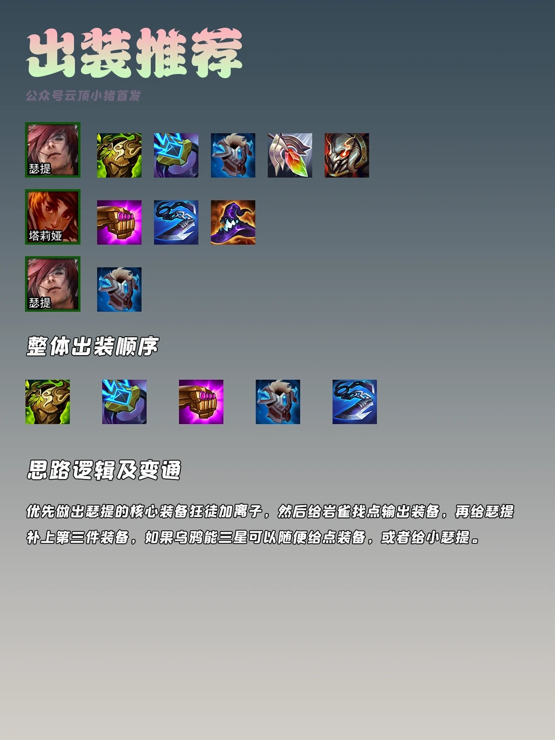 装备思路:优先做出瑟提的核心装备狂徒加离子,然后给岩雀找点输出装备,再给瑟提