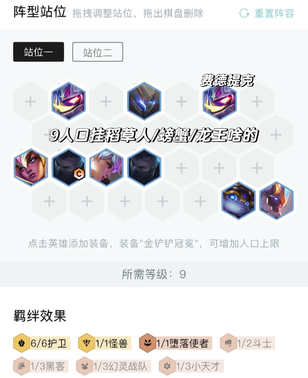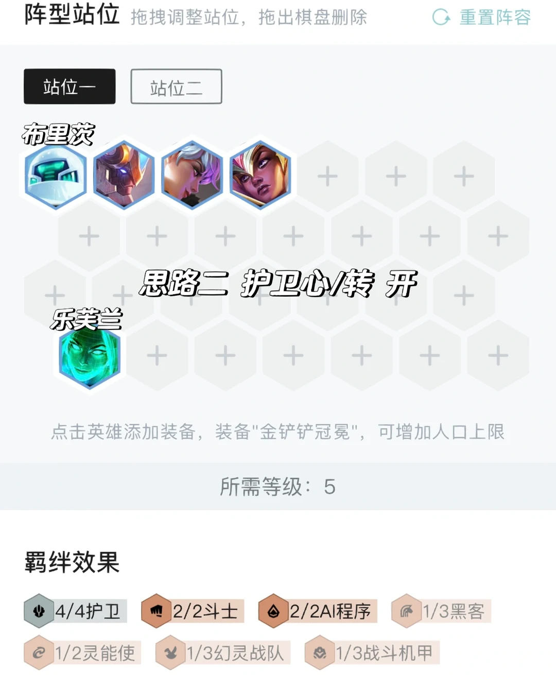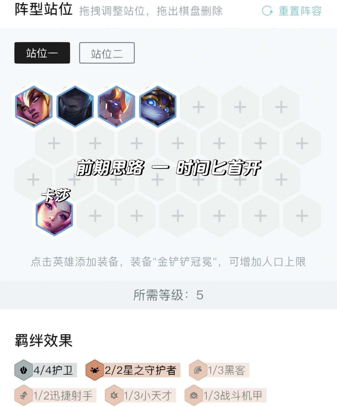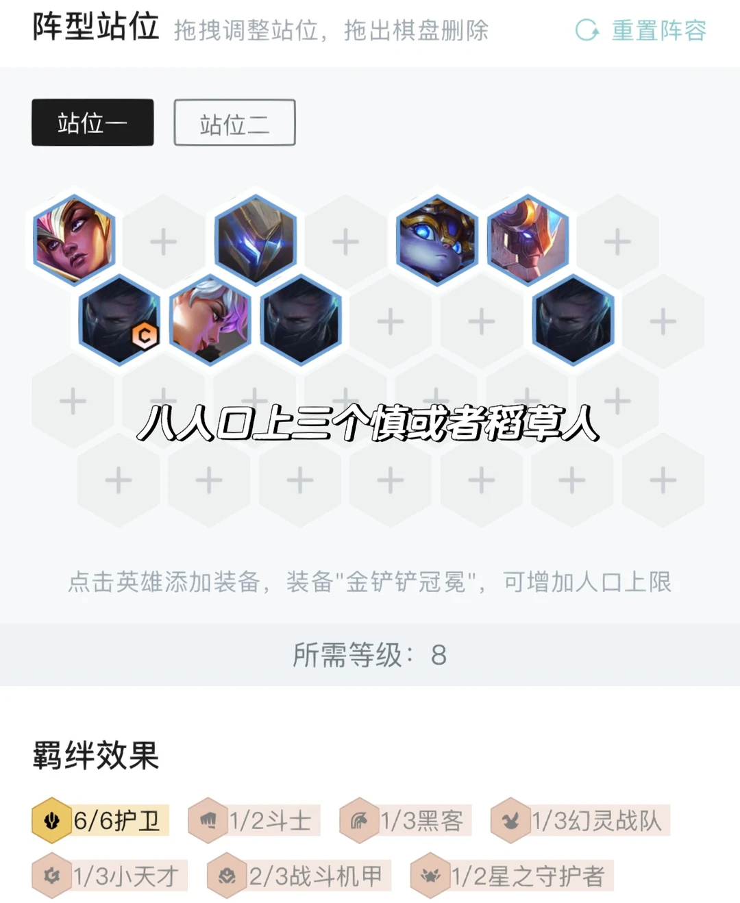 前期最理想是4护卫配点输出过渡,然后中期有护卫心的情况下6人口直接搜牌搜出6护卫,两之慎随便锁血,如果没有则直接搜7搜牌,刚需盖伦开6护卫,然后两之慎慢慢抽到全二星上8。