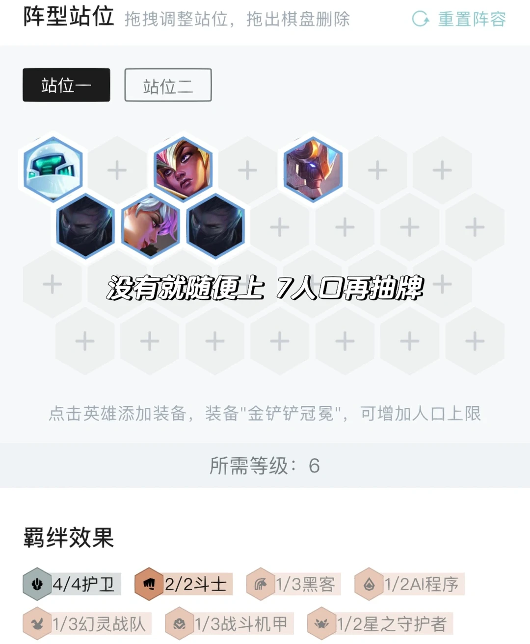 正常节奏2-1拉4,2-4拉5,3-2拉6小抽牌,4-1拉7再抽两波,最好6只慎或者4只也面前够用。不要心疼经济,阵容就是2星慎锁血然后上人口的,没有好事成双不追三。