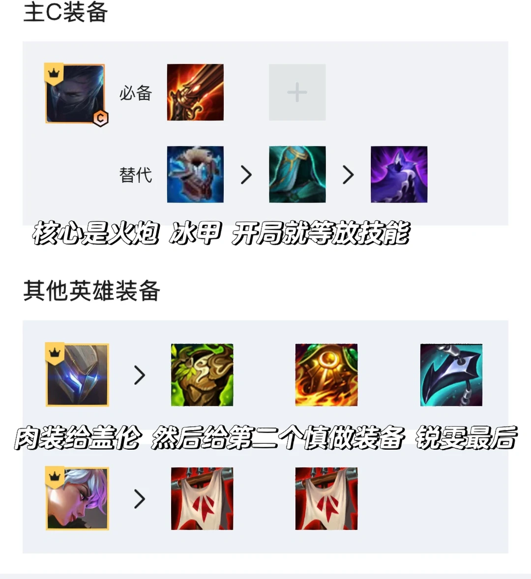 肉装盖伦,然后给第二个慎找个火炮,是在没有就算了,最后有旗子可以给锐雯吃,一般不做锐雯装备。
