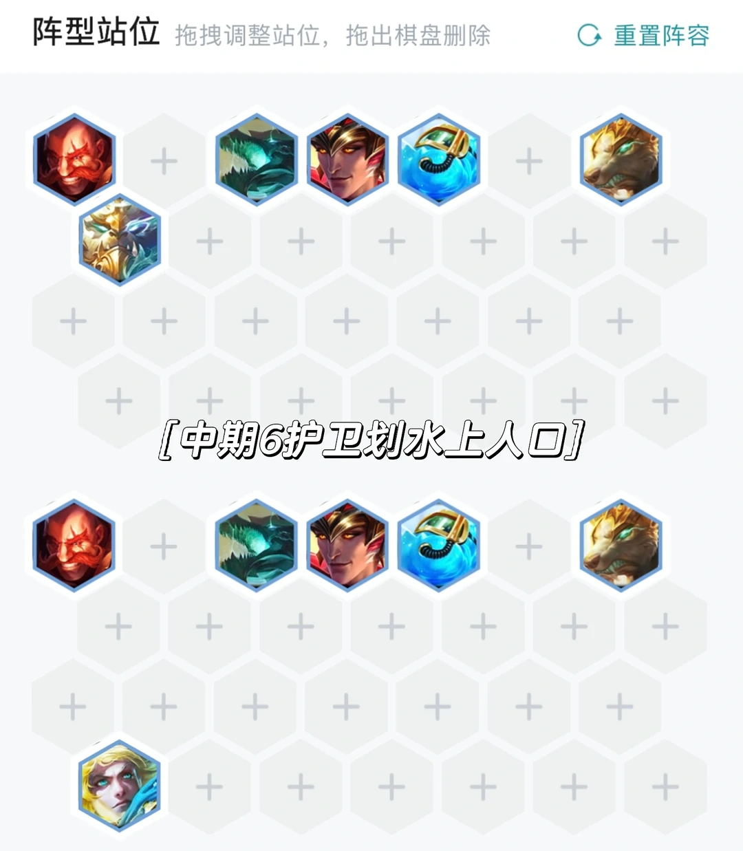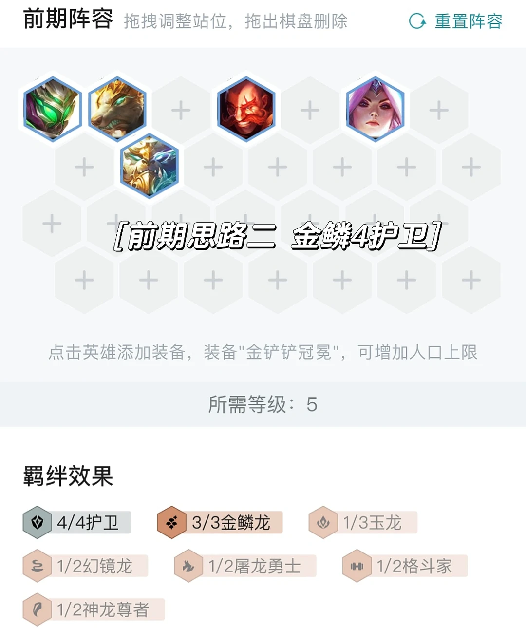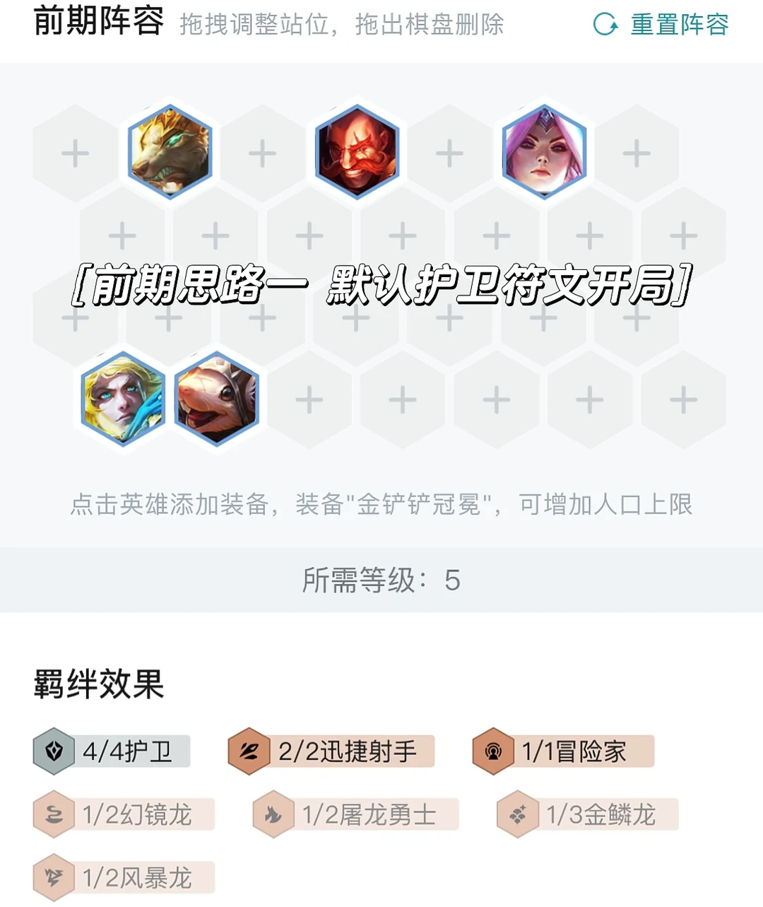 前期可以用射手EZ当主C搭配老鼠二射手4护卫轻松连胜,也可以用狗熊当主C开三金鳞还能贪经济,有四护卫一般来说输也不会怎么掉血,平稳过度到八人口即可。