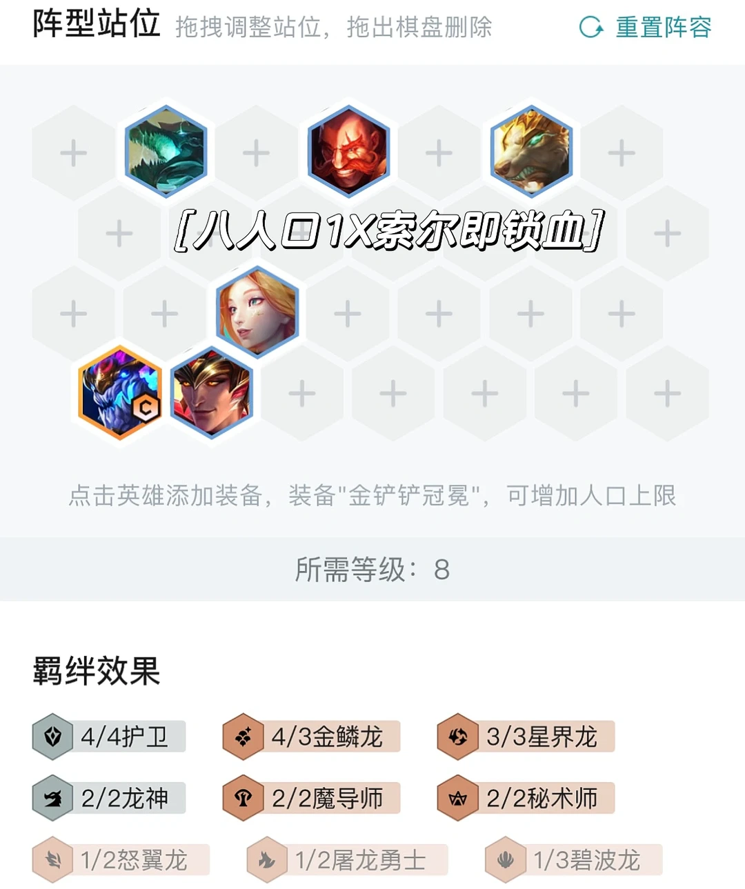 一般顺风4-2拉8后,每回合抽10块提升质量,找到一星索尔和二星金龙就能锁血,有复制器的局则可以8人口直接找到二星索尔。