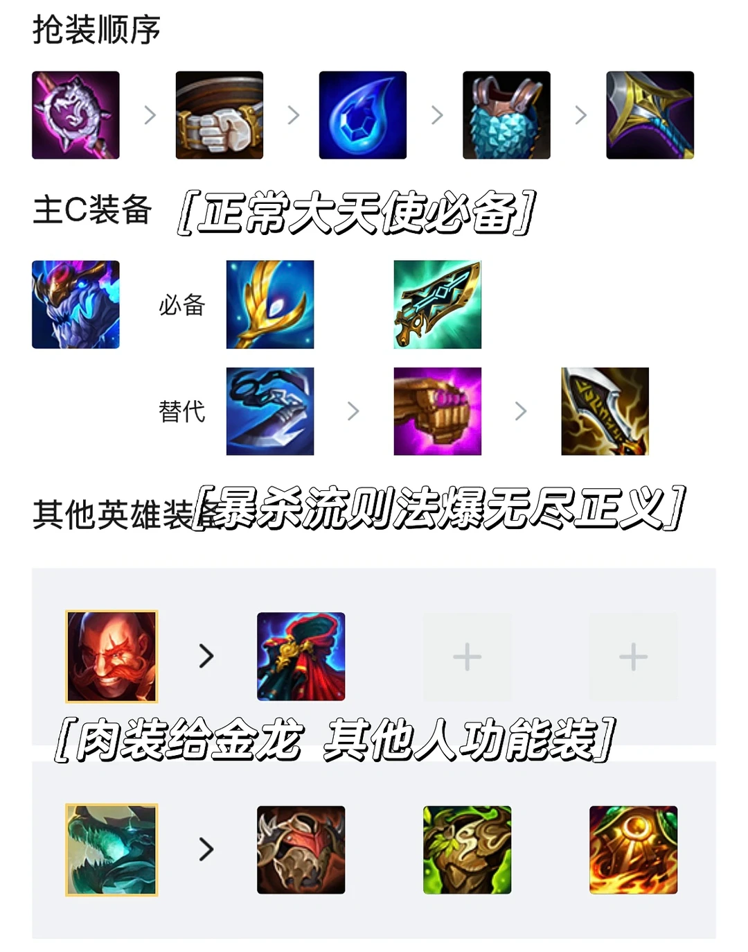 装备思路:索尔刚需大天使,这是最匹配它和这套阵容的装备,其次是续航,科技枪可以增加阵容整体坦度。另外也可以选择无尽法爆正义爆杀流,肉装都给到金龙,如果布隆能三星也可以吃装备。
