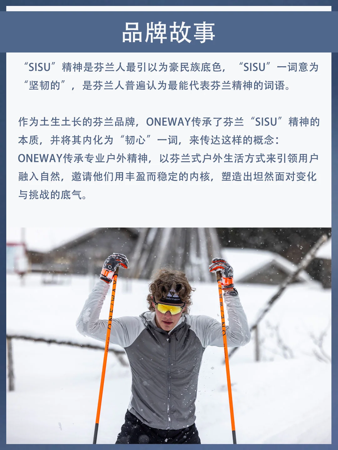 作为土生土长的芬兰品牌,ONEWAY传承了芬兰“SISU”精神的本质,并将其内化为“韧心”一词,来传达ONEWAY传承专业户外精神。ONEWAY传承专业户外精神,以芬兰式户外生活方式来引领用户融入自然,邀请他们用丰盈而稳定的内核,塑造出坦然面对变化与挑战的底气。