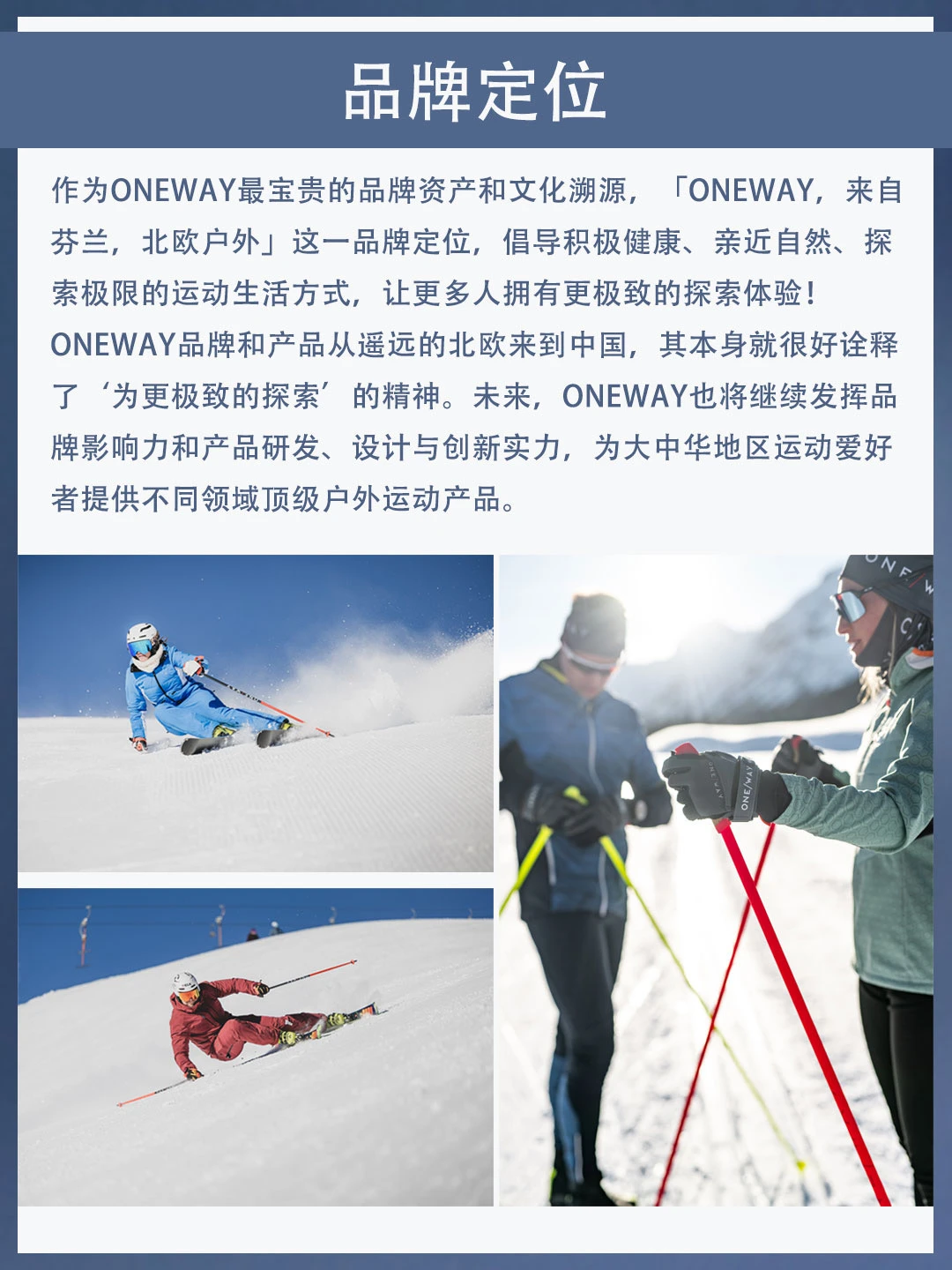 ONEWAY品牌名称的由来,代表着滑雪运动的核心技术“单向性能技术”。