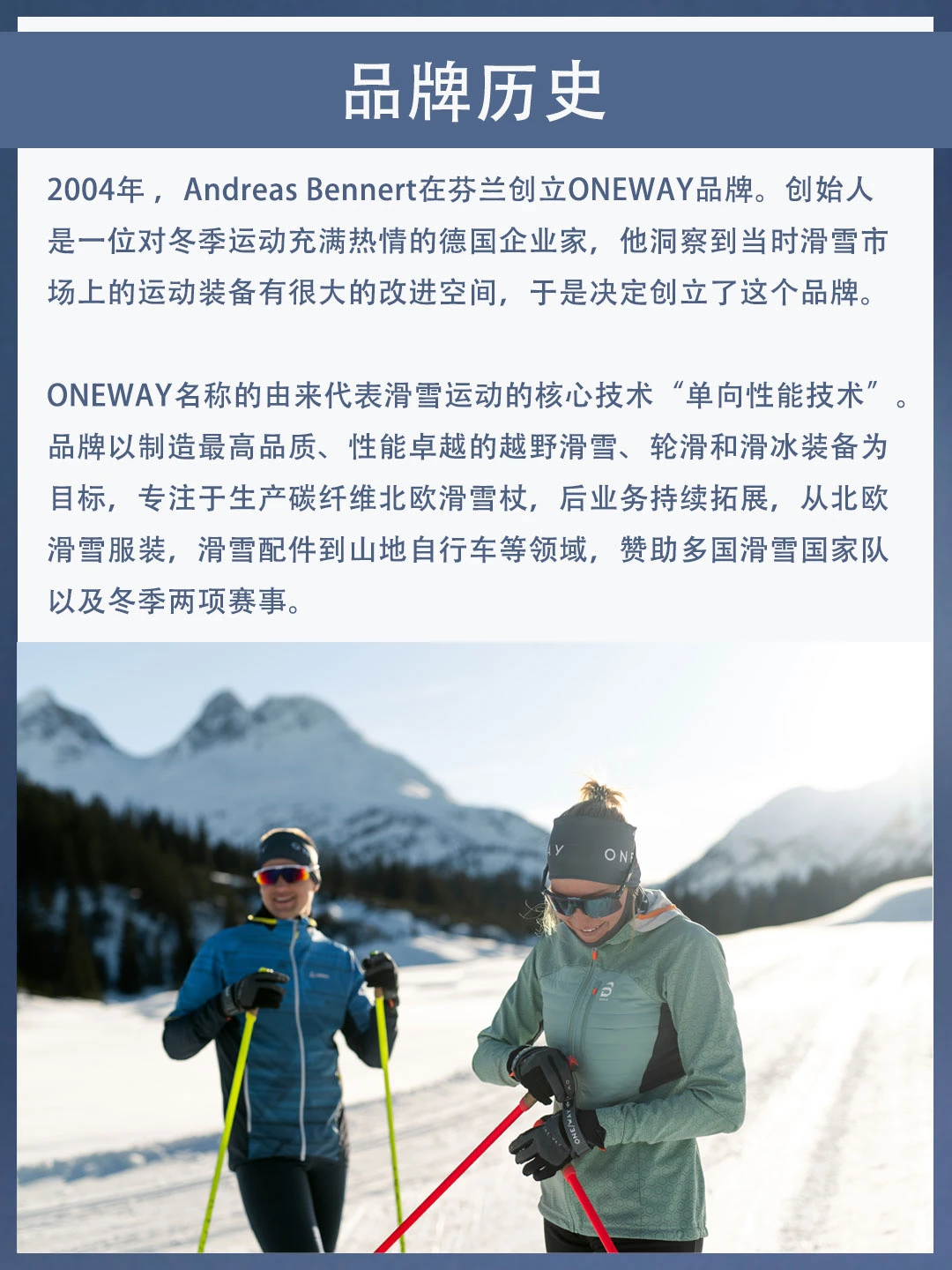创始人Andreas Bennert是一位重度滑雪和骑行爱好者,ONEWAY从创立之初就带着深厚的滑雪基因,初衷是为滑雪和骑行爱好者们带来足够专业的产品和装备。