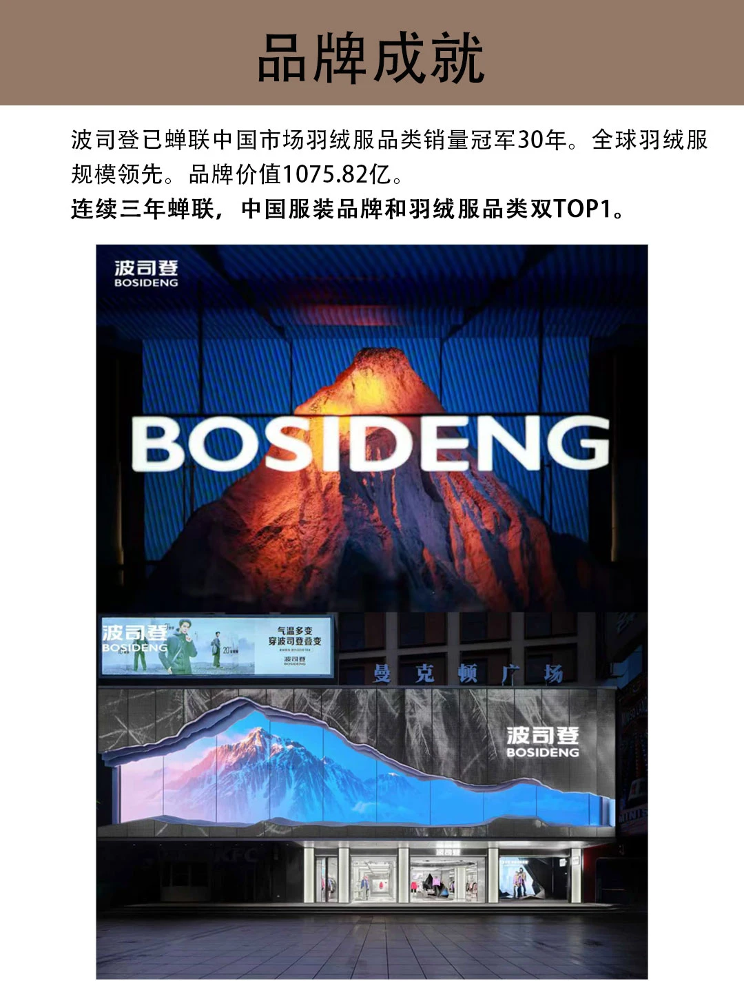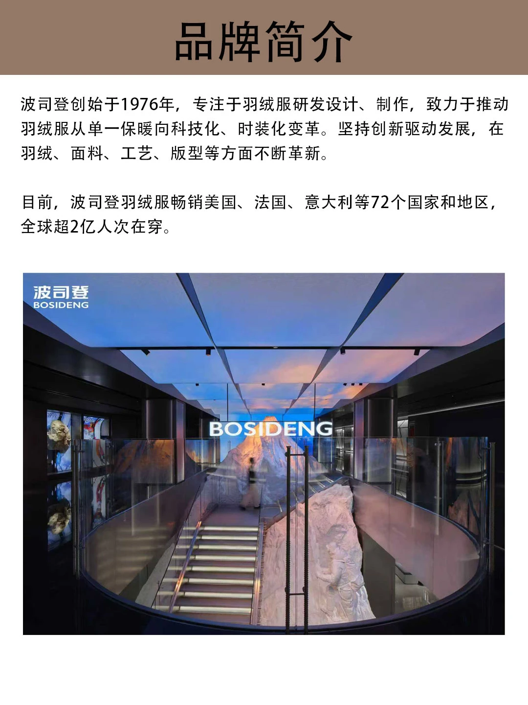 波司登创始于1976年,致力于推动羽绒服从单一保暖向科技化、时装化变革。凭借49年的专业积淀,波司登在规模、产品、渠道、运营都引领全球羽绒服行业发展,实现了中国羽绒服全球领先