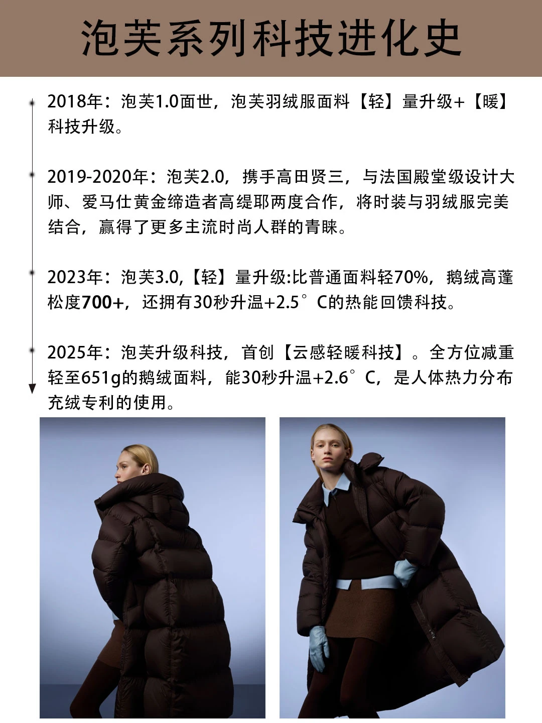 2018年,波司登将新一代更为轻暖的面包服系列命名为【泡芙】。泡芙持续聚焦“轻暖舒适+时尚设计”迭代进化。2025年,泡芙升级科技,首创【云感轻暖科技】,先后与多位全球设计大师联动,提出 “轻时尚”设计理念,并登陆巴黎时装周