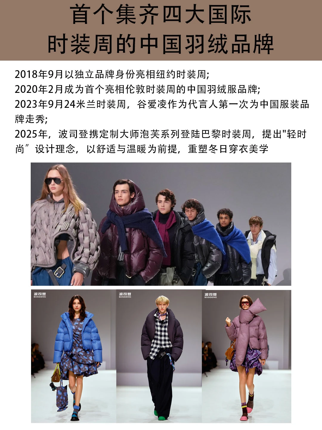 2025年,波司登携定制大师泡芙系列登陆巴黎时装周,提出 “轻时尚”设计理念,以舒适与温暖为前提,重塑冬日穿衣美学