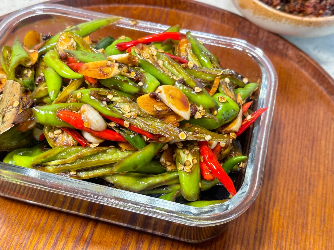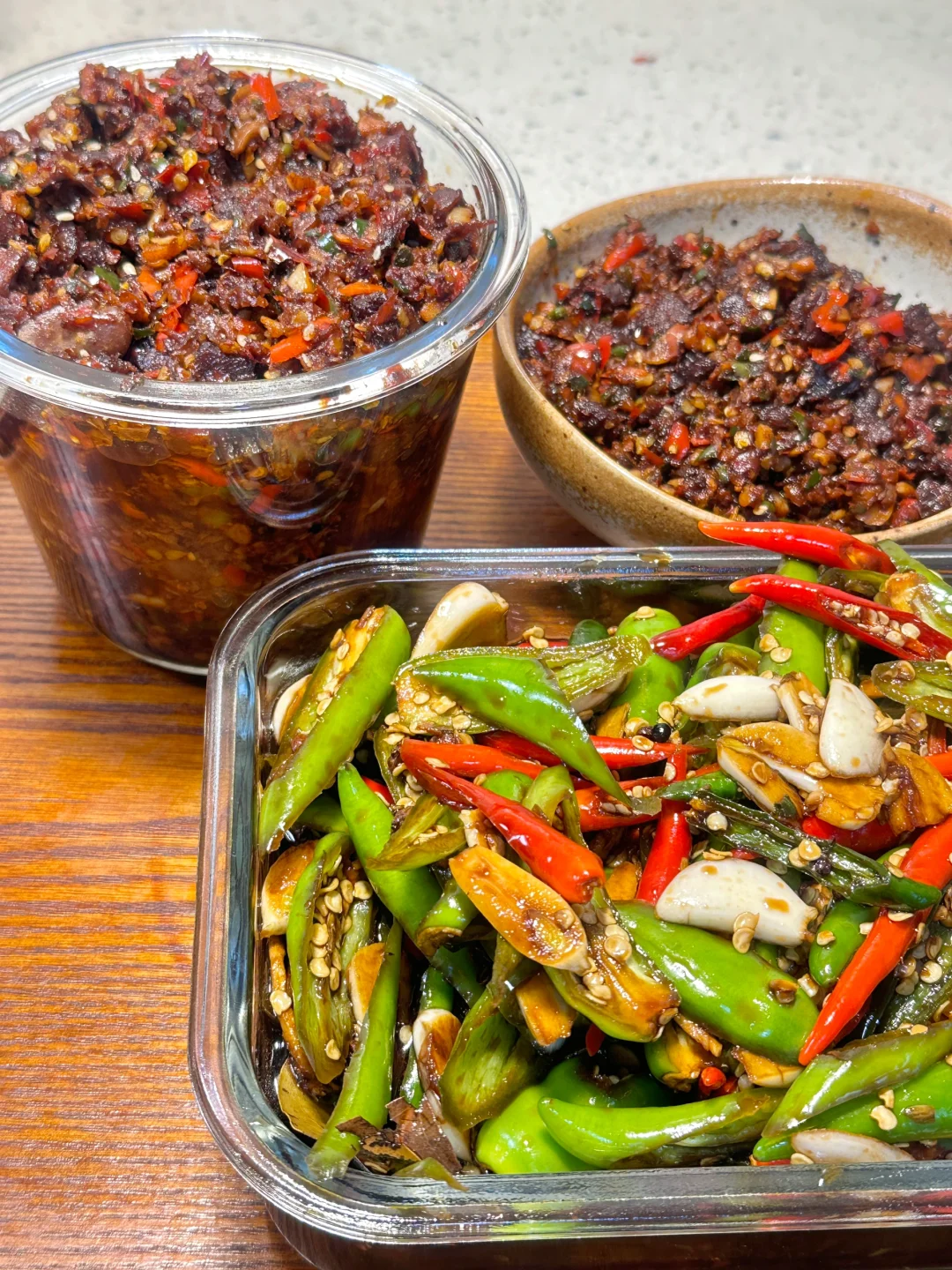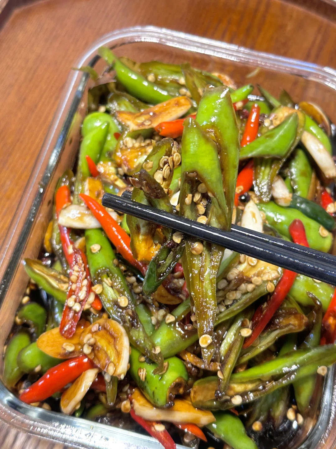 1️⃣:辣椒不要去蒂,清洗干净晾干水分后再去蒂斜刀切大片,加两小勺盐拌匀腌出水(大概一小时)腌的时候准备料汁。