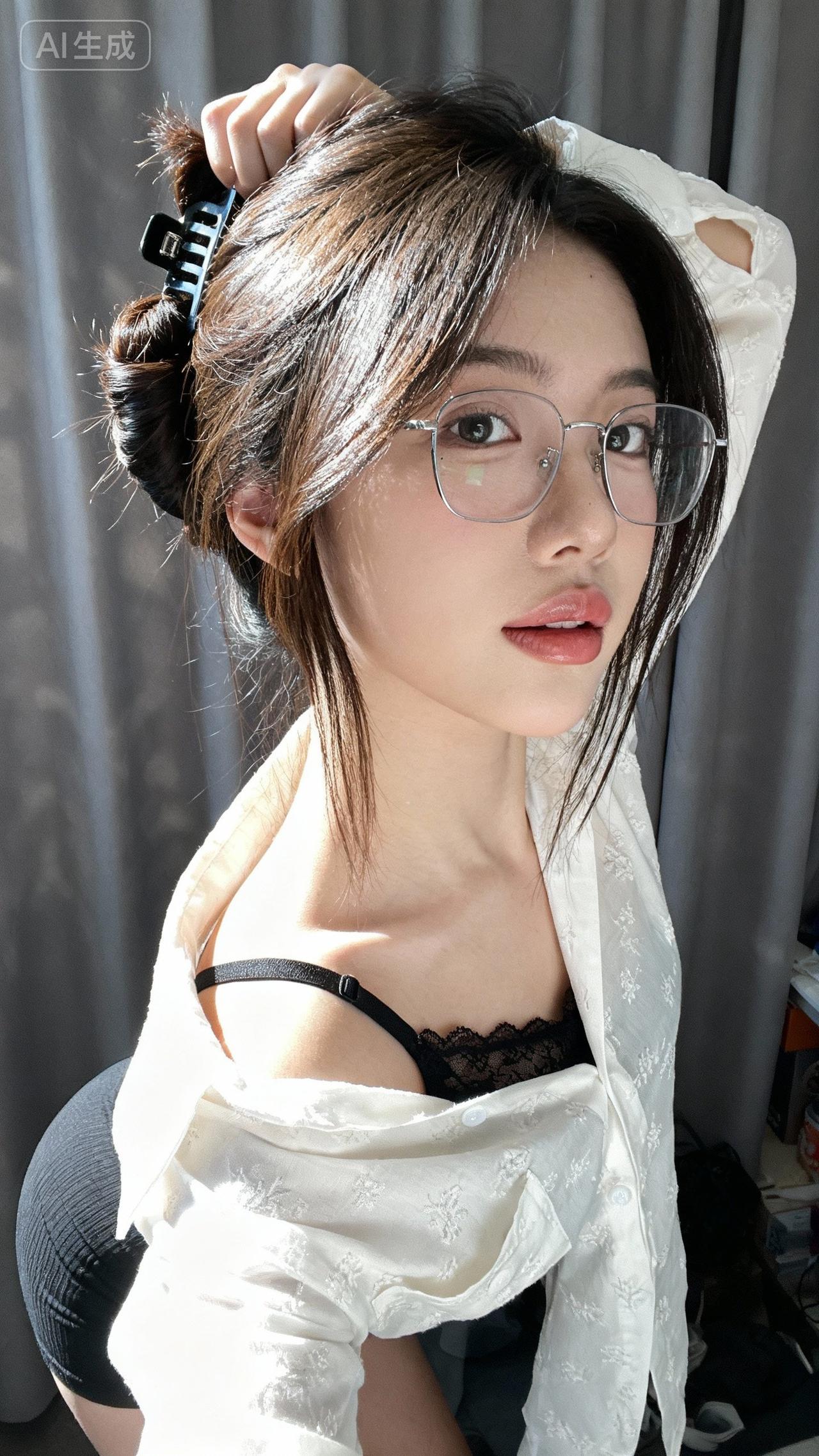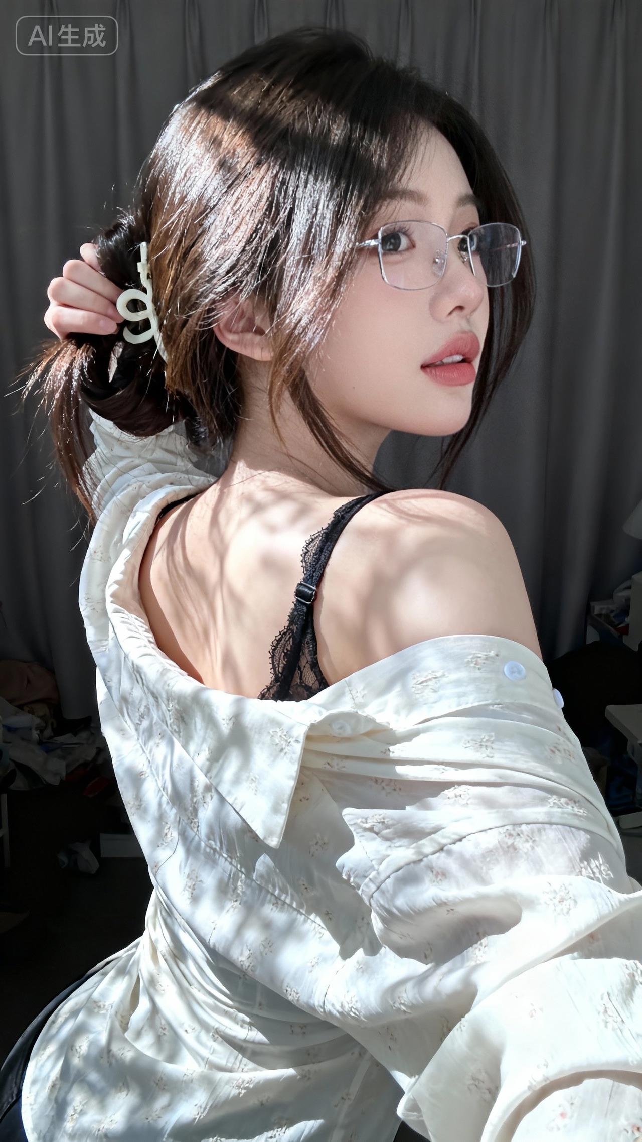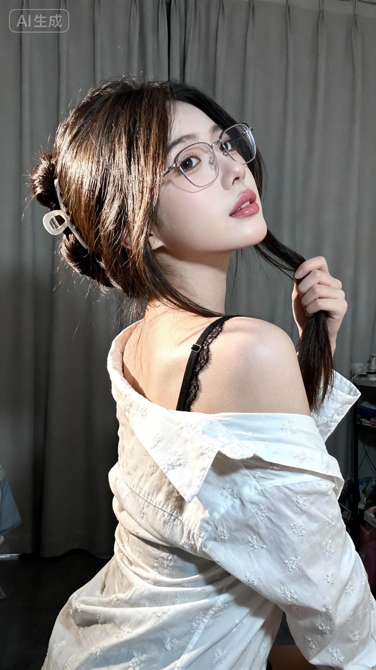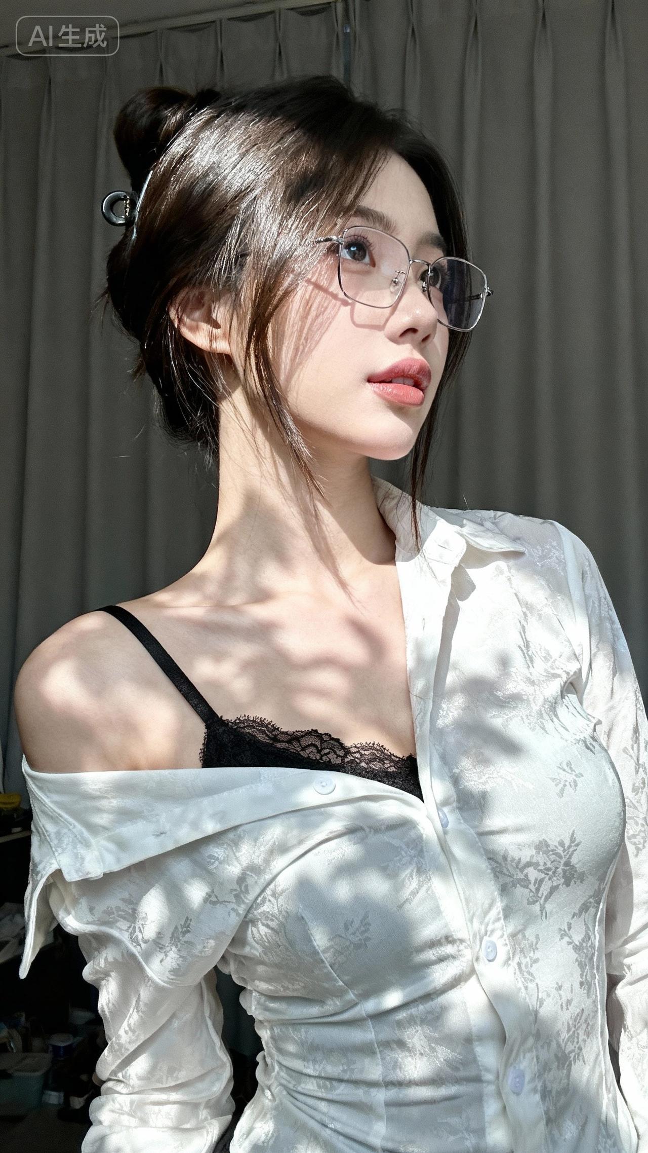 复古眼镜少女,黑白蕾丝与白纱的完美搭配,尽显优雅气质。
