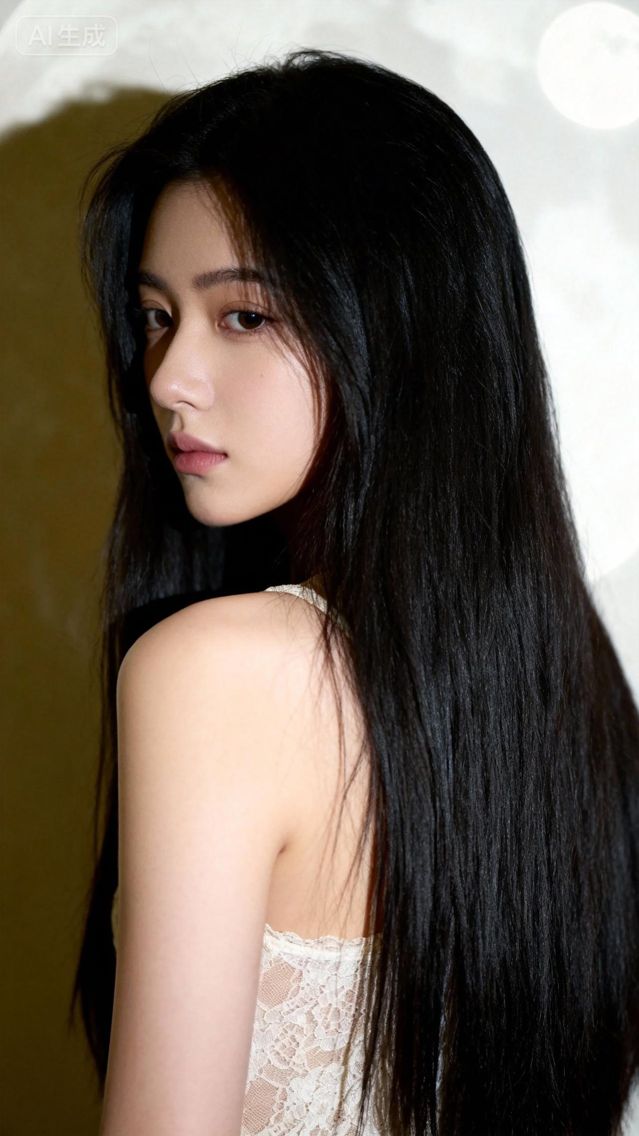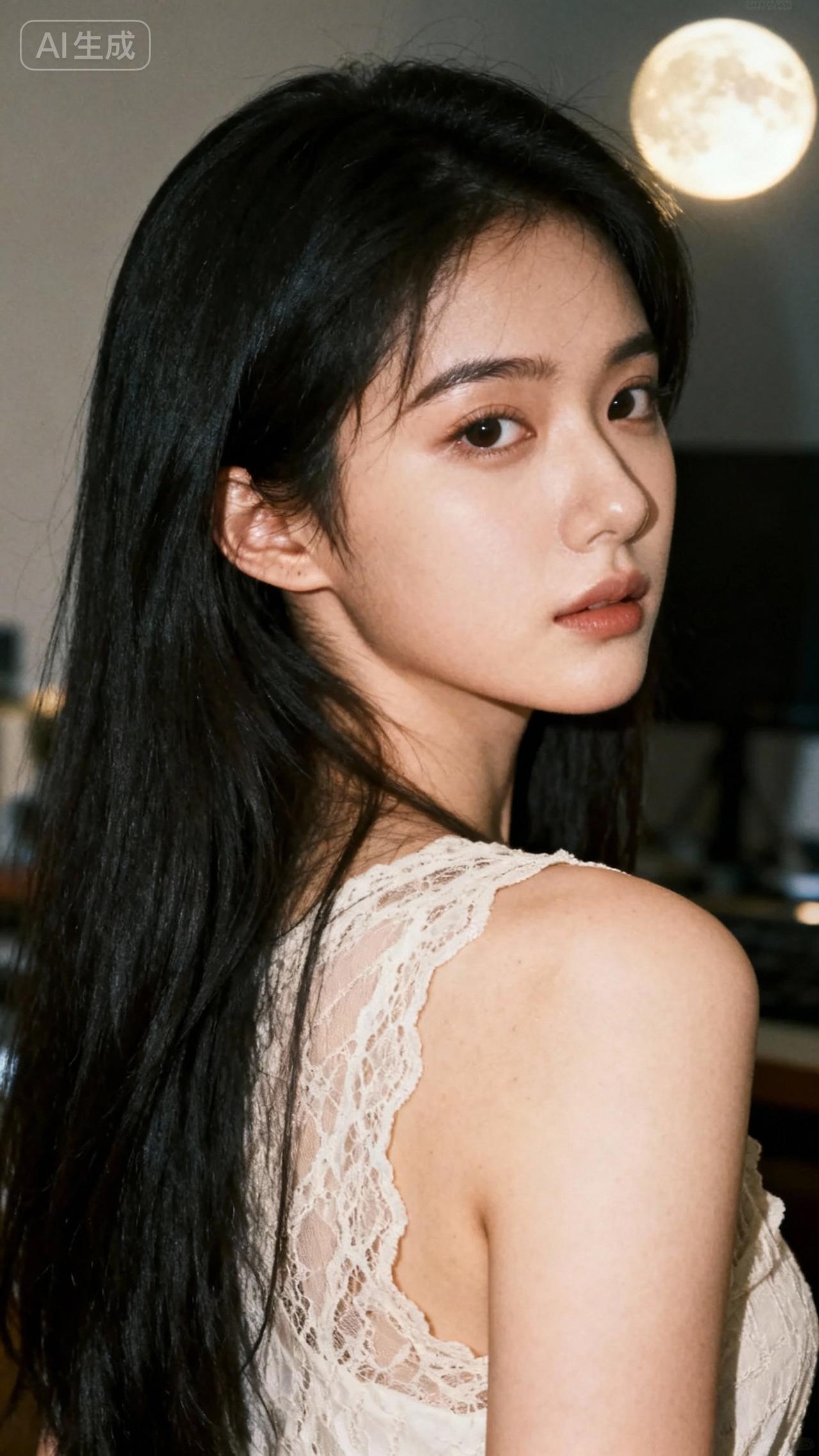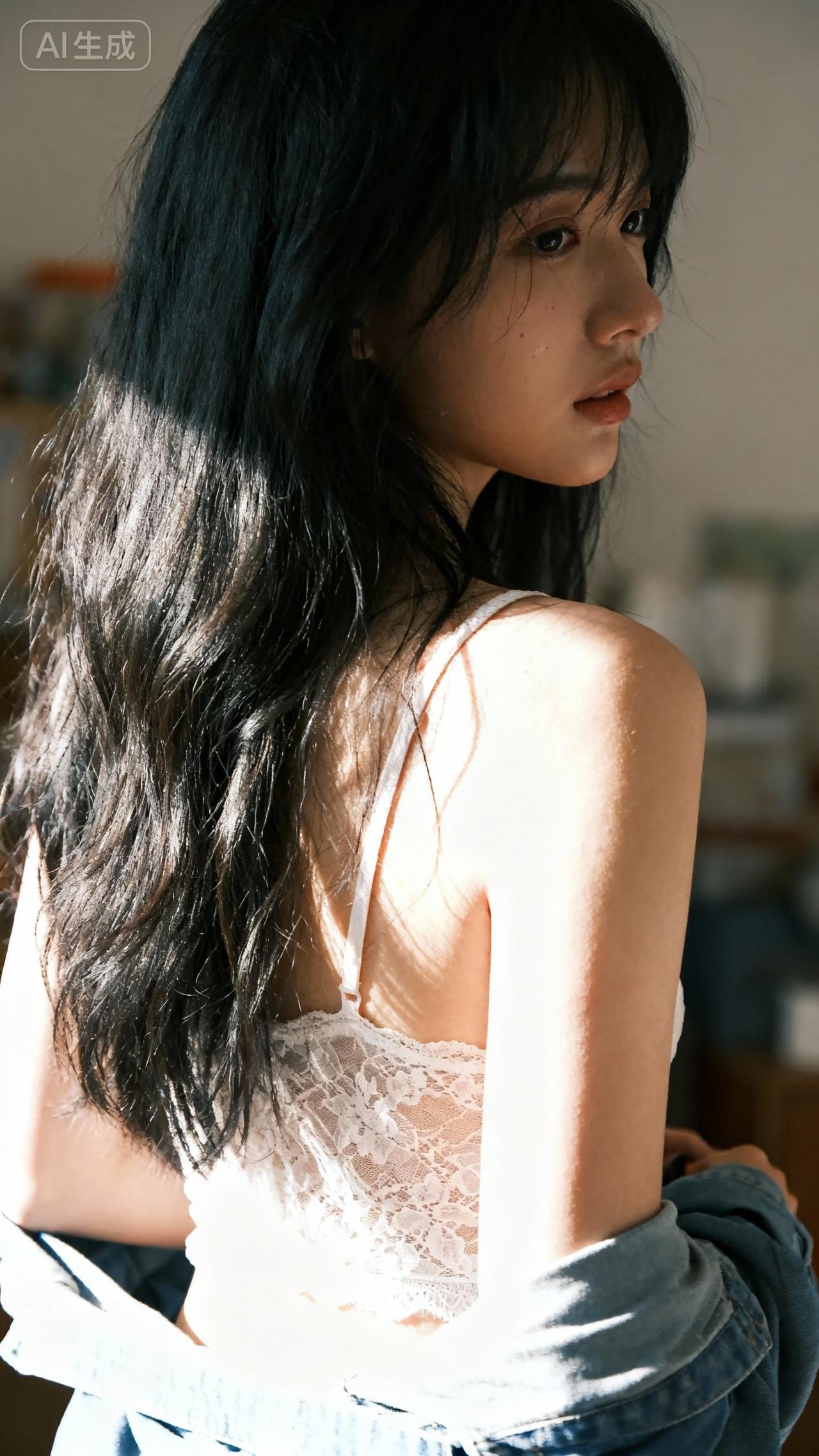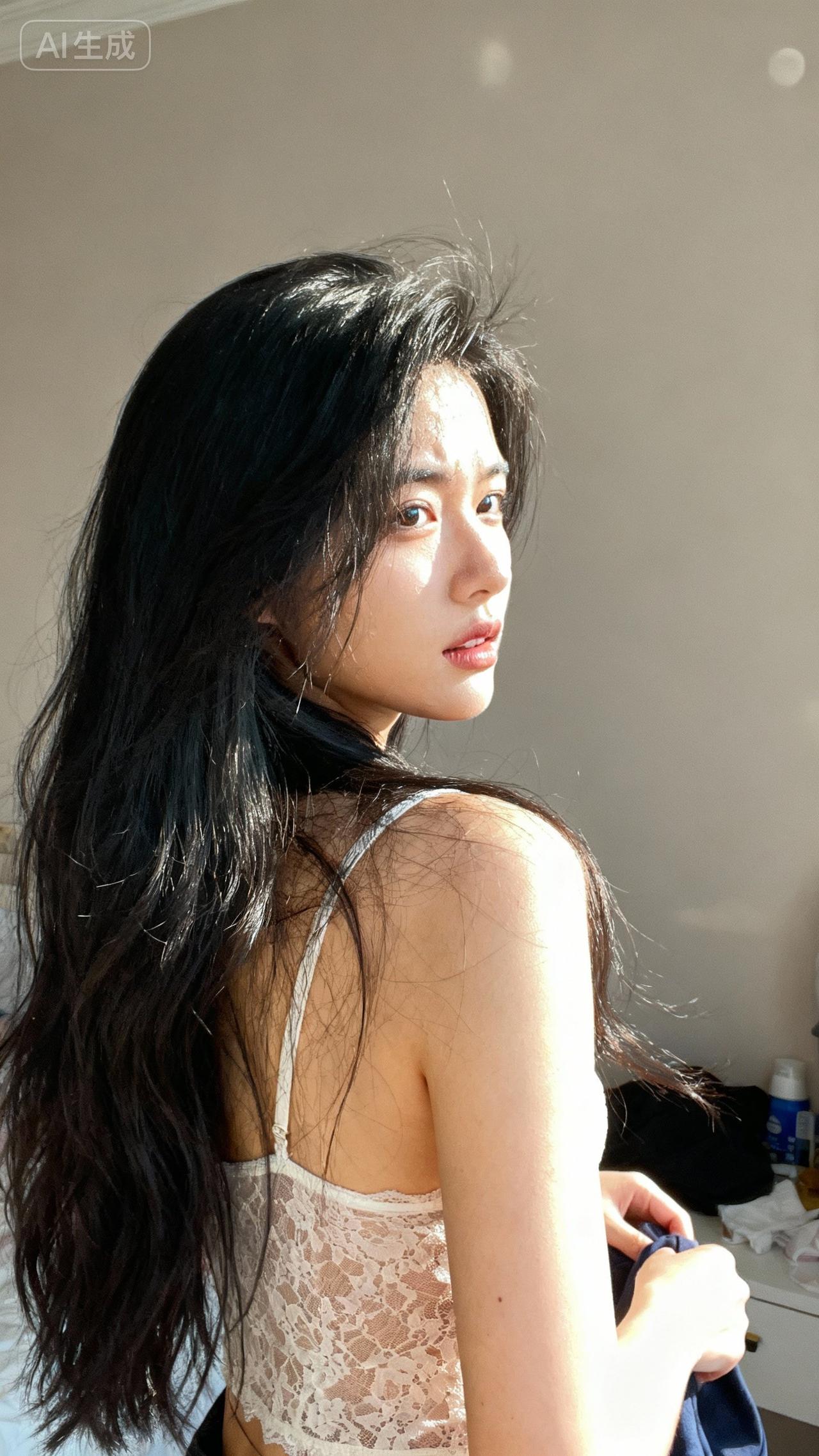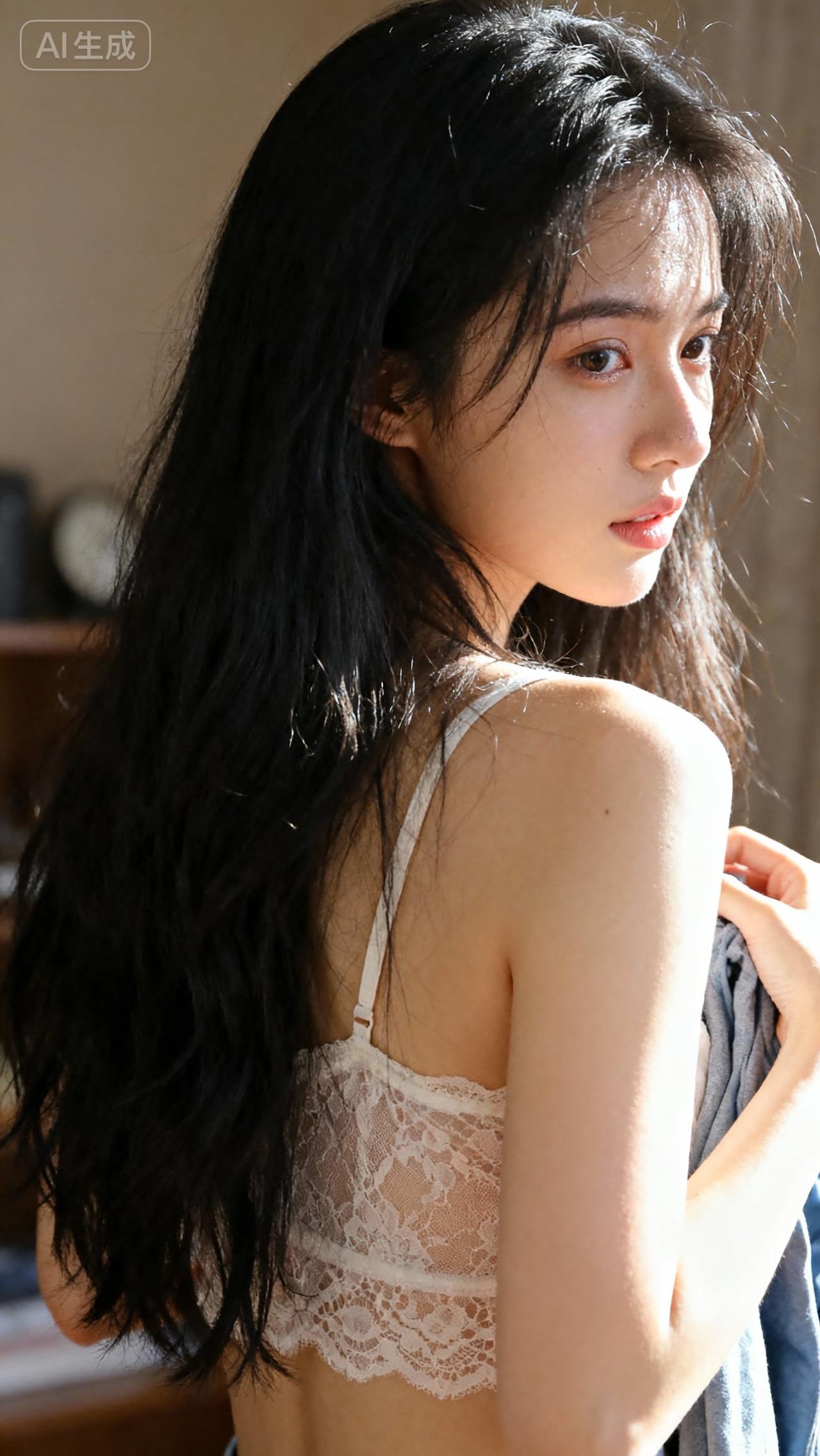 优雅黑发少女,蕾丝裙摆,复古画框,静谧卧室时光。
