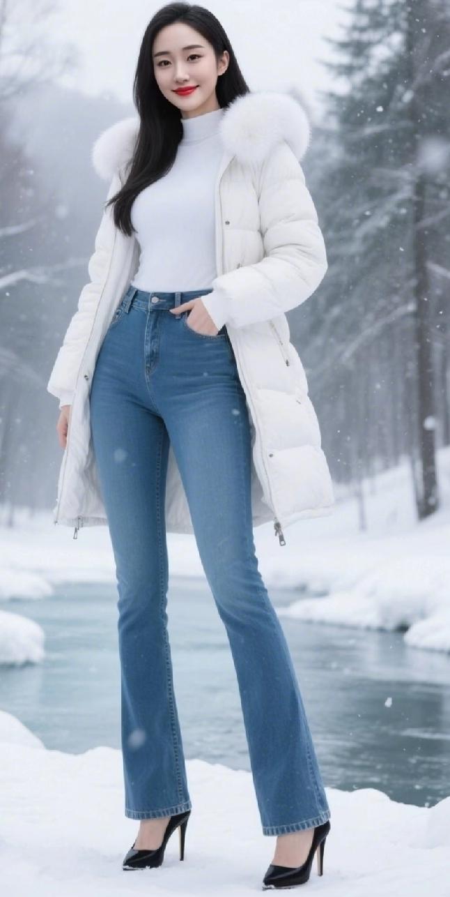 冬日雪时尚穿搭,白色羽绒服与牛仔裤的完美搭配,尽显优雅与温暖。羽绒服穿搭 羽绒服