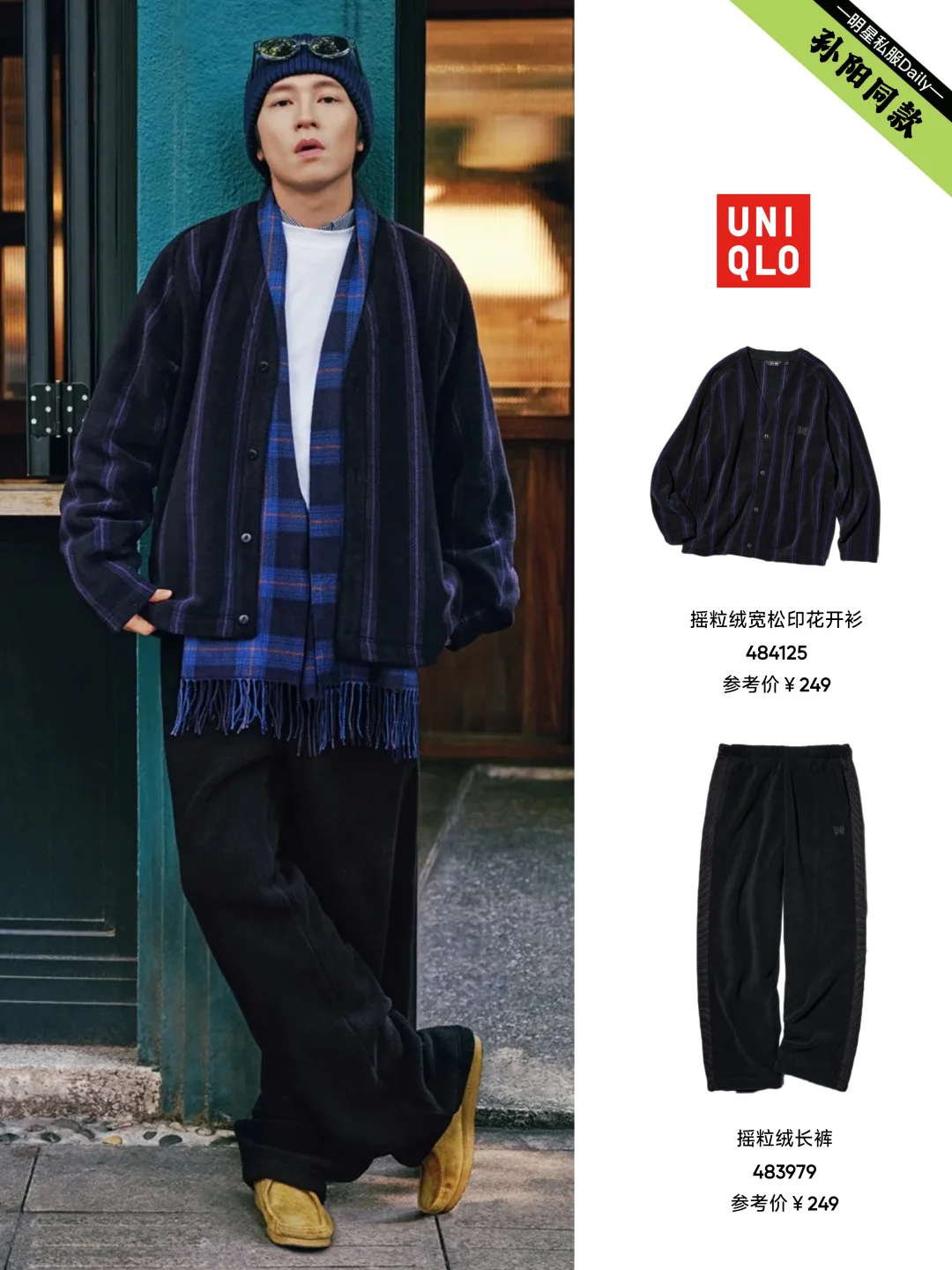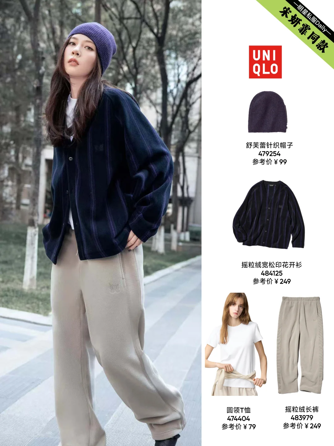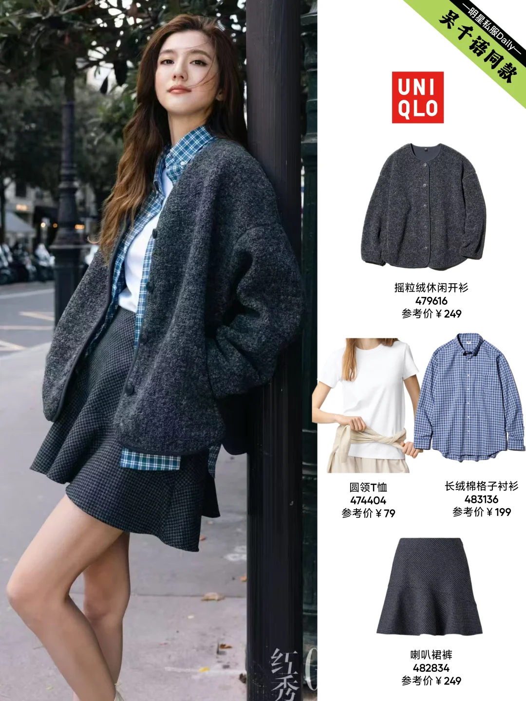 今年优衣库的摇粒绒被好多明星翻牌啦!周洁琼近期的摇粒绒叠穿思路真的有被惊艳到!摇粒绒外套里搭菱格毛衣 + 衬衫,下装配一条百褶半裙,甜妹感和率性范儿平衡得刚好。