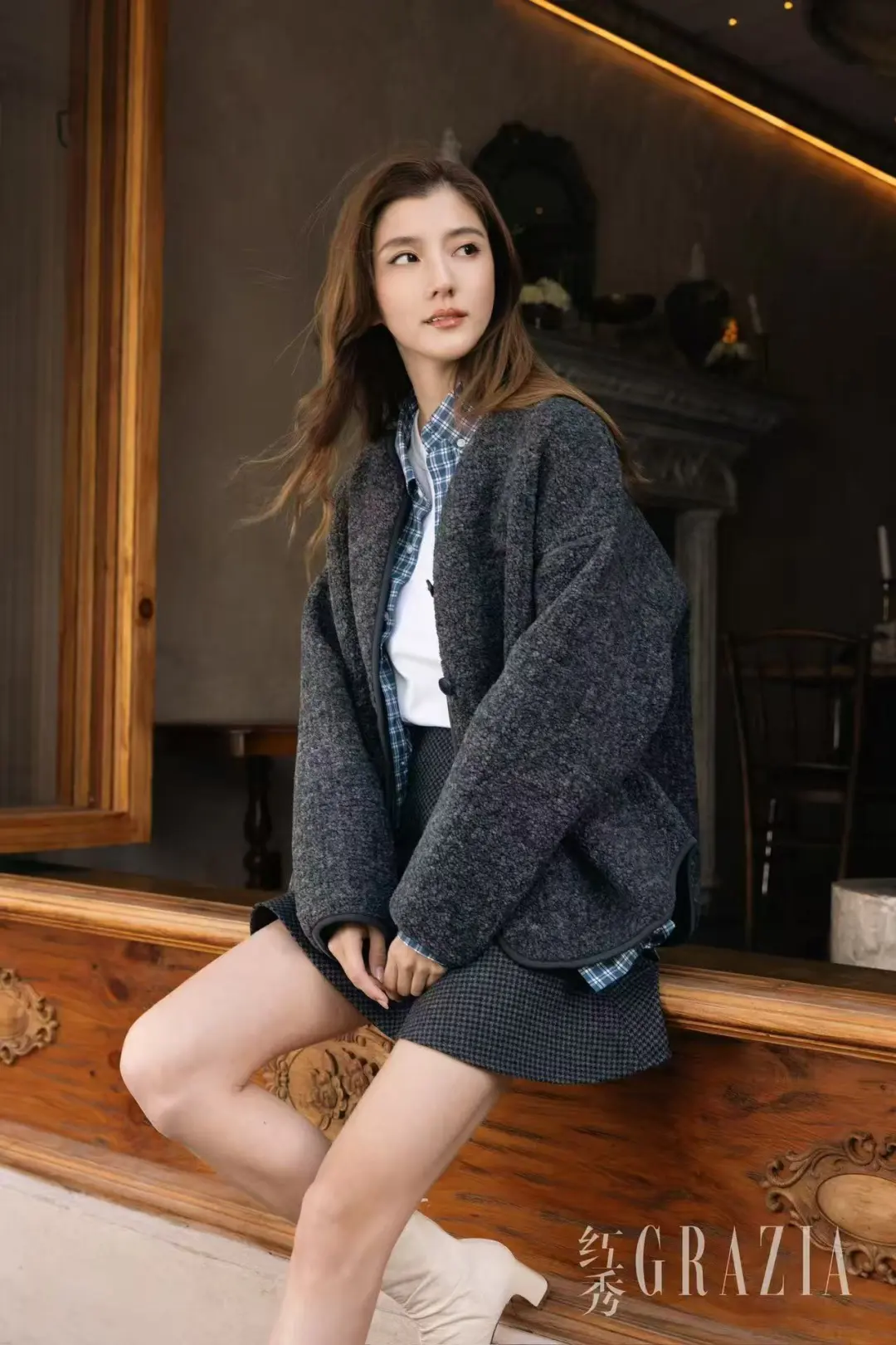 而穿摇粒绒的吴千语,精致学院感十足,内搭白T + 格子衬衫和喇叭裙裤,简约却不单调,日常通勤或约会穿都超合适。