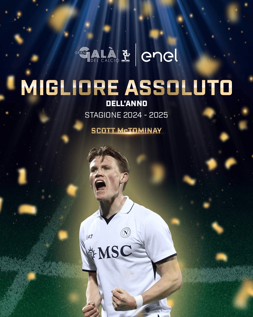 在颁奖现场,当主持人宣布他当选“年度最佳球员”时,全场起立鼓掌向这位苏格兰国脚致意。麦克托米奈也由此加入了一份历史级的获奖者名单,名单中包括齐达内、卡卡、皮尔洛和C罗在内的一众传奇球星,进一步巩固了自己在意甲的地位。