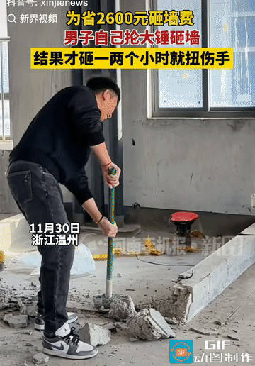 笑不活了!近日浙江温州,为了省下2600元砸墙费,男子亲自上手轮着大锤干,结果才