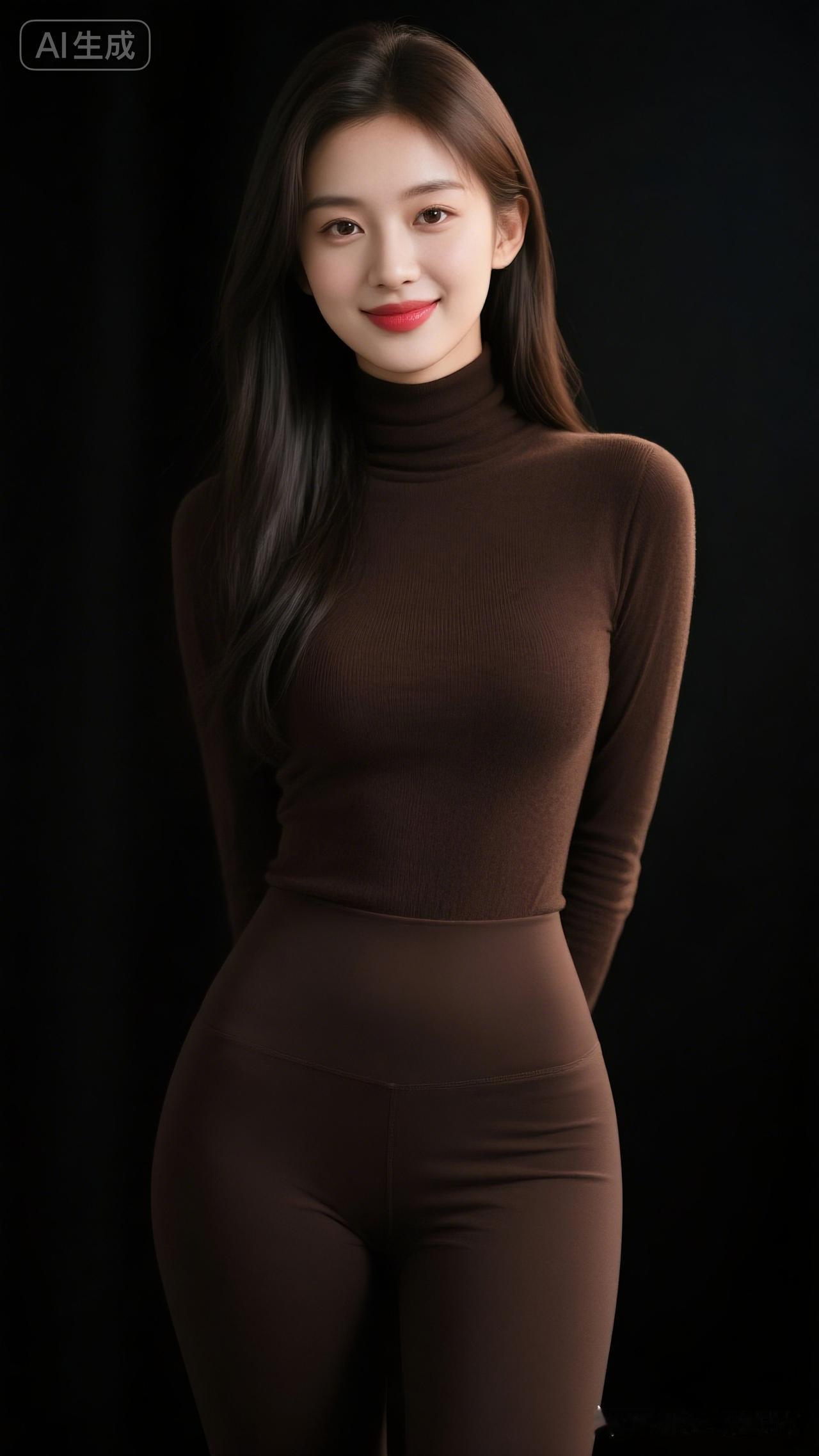 优雅气质,棕色紧身衣,完美身材,自信微笑