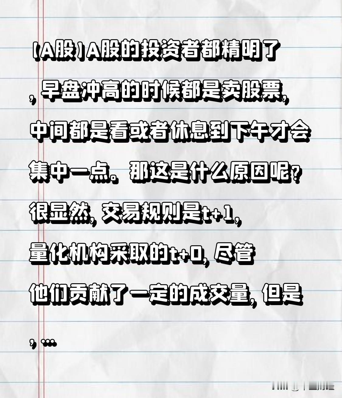 【A股】A股的投资者都精明了,早盘冲高的时候都是卖股票,中间都是看或者休息到下午才会集中一点。 那这是什么原因呢?很显然,交易规则是t+1,量化机构采取的t+0,尽管他们贡献了一定的成交量,但是,这种倒鸡毛式的操作,早晚会出现问题甚至出现严重的亏损。 问题的关键是机构可以t+0,中小投资者却是t+1,这种背景下的股市运行,不仅仅是有失公平,同时也造成市场效率以及时间的浪费。 如果市场全方位推行t+0且无涨跌幅限制交易,市场效率以及定价规则和市场对冲的公平性,将会体现。 否则的话,量化导出的成交量,再累积到一定的程度,甚至无法放大的背景下,少部分个股表现,绝大多数股票下跌疲软将成为市场中长期的一个走势。