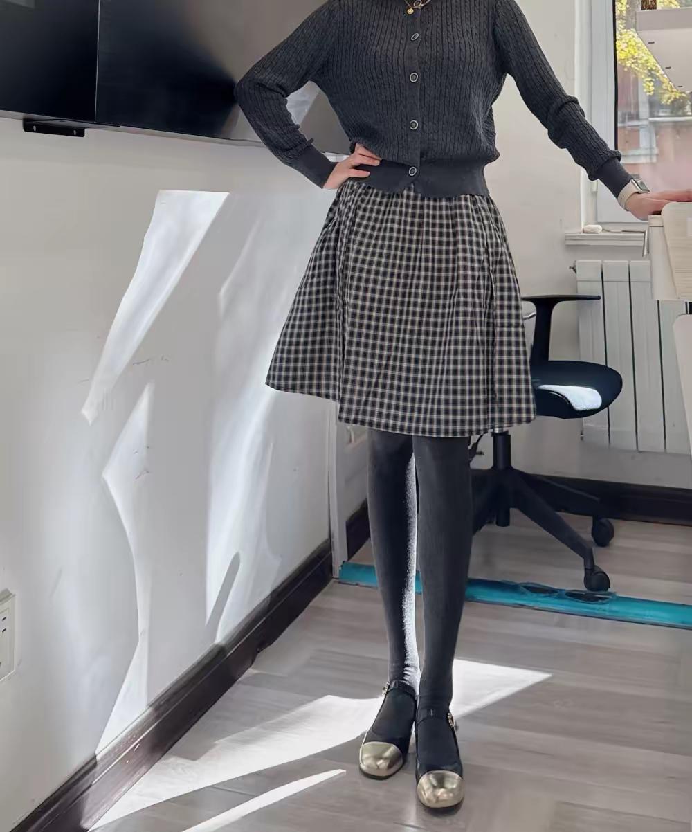 冬日灰调暖暖穿搭 上身是灰色带扣的毛衣,下身是格子百褶裙,腿上的灰色裤袜是羊绒的