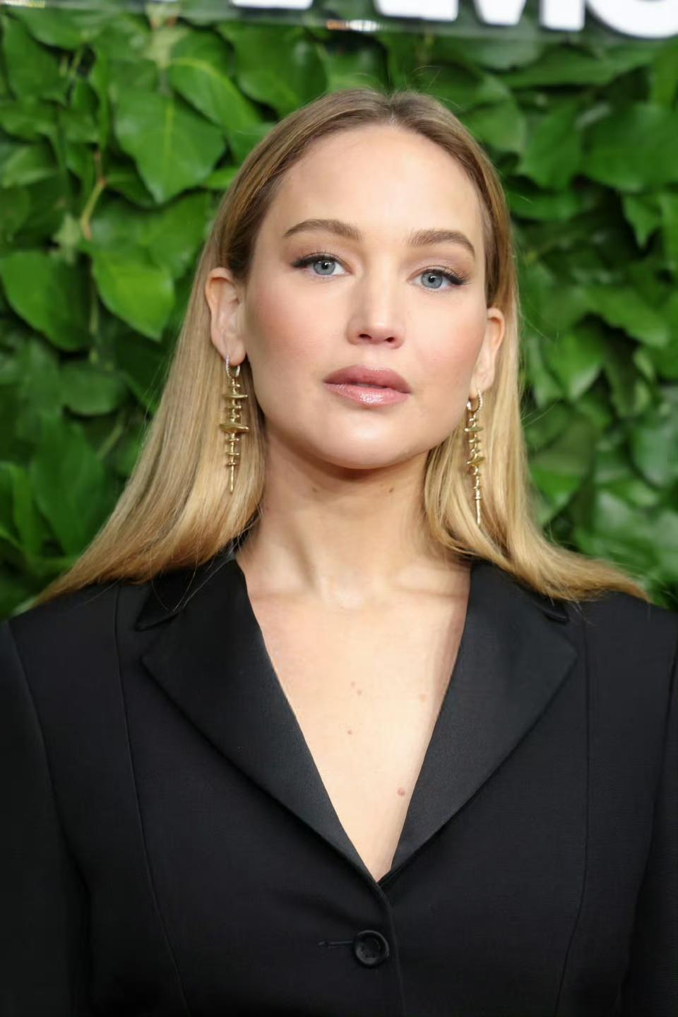 大表姐Jennifer Lawrence优雅亮相第35届哥谭奖红毯现场,脚踩高跟