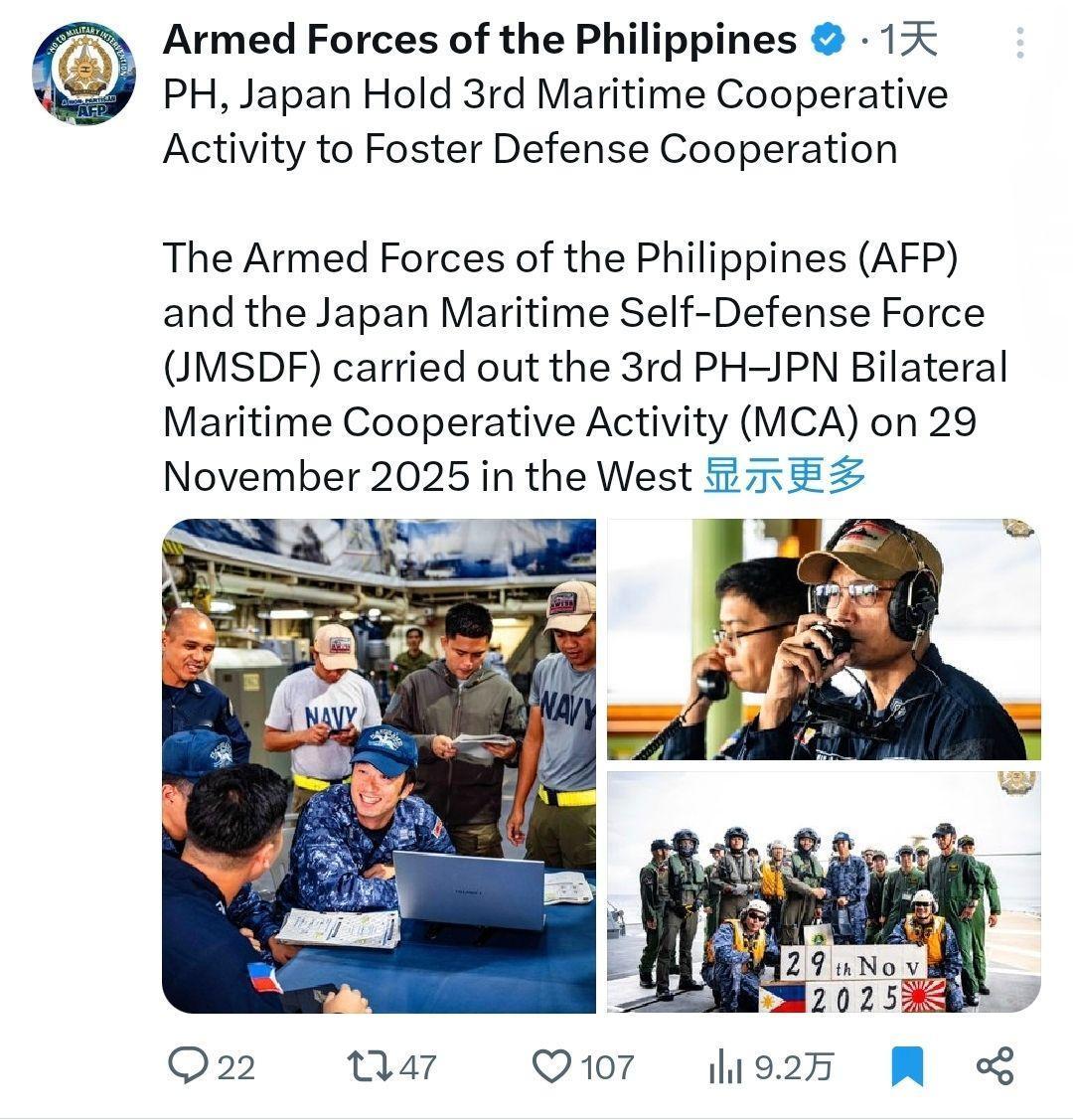 日菲联合军演,华为笔记本成主角,反华是口号,亲华才是生活? 近日,菲律宾武装部队官方账号在社媒上发帖,总结了日菲两国于11月29日在南海举行的联合军演的情况。然而,不管菲律宾人把这次军演吹得多好,也不管他们的字里行间如何想说“日菲两国要一起反华”,他们假装强硬的模样,都被一张照片戳穿了。 看图1和图2,在菲军放出的照片中,赫然出现了一台华为笔记本电脑,看样子,里面应该存着此次军演所需的一些资料,日菲两国军人正在对照着这些资料,热火朝天地讨论着军演计划。而不管是讨论的、记录的、拍照的,没有一个人觉得这个笔记本不对,菲军甚至都没有给电脑的品牌打码,就这么堂而皇之地发了出来。 网友们很快注意到了这个细节,纷纷涌进了菲军账号的评论区。有个别人高喊“华为是安全漏洞”,更多人则在嘲讽日菲“反华是口号,亲华才是生活”。截至12月2日,菲军仍没有替换图片,或许他们自己也知道,相比美国产品,华为才是更优秀、更安全、更不容易泄密的选择。