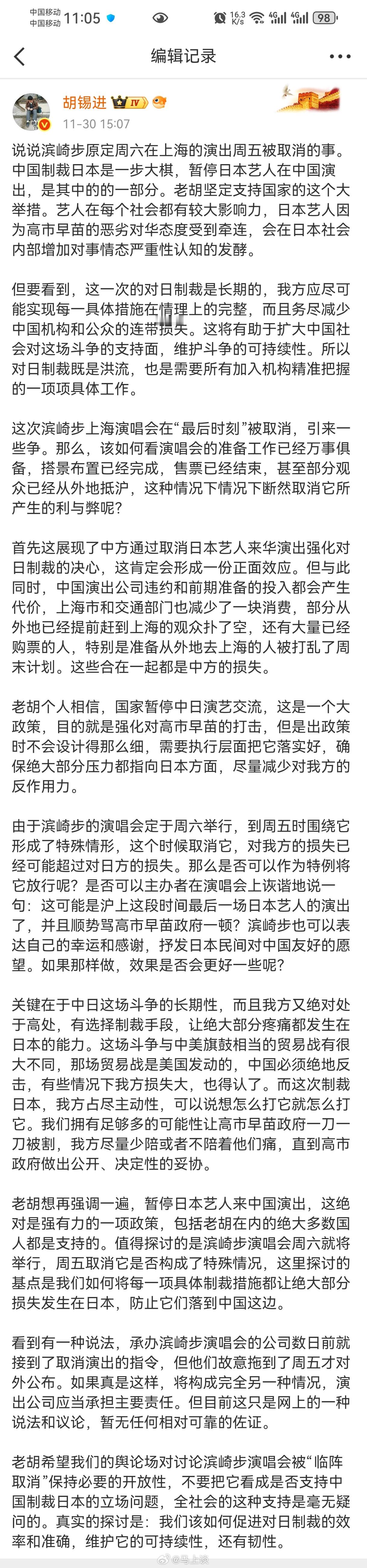 老胡这次真栽了…关于滨崎步上海演唱会,他洋洋洒洒写了几千字,结果“一个人的演唱会”是工作人员造谣…滨崎步团队声明是“偷拍”,倒是摘的干干净净,这不是把我们胡锡进同志架在火上烤么?那夜,老胡思索良久,把先前的微博编辑修改无数次,删了又恢复,头发又白了几根…