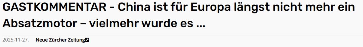 德媒称不用跟中国客气?2025年11月27日报道,德媒:中国不是欧洲的头号金主了,也不用再跟中国客气! 在当下的国际环境中,中国就是西方众多国家眼中的一块“肥肉”。多个国家都想要吞并中国,但同时又畏惧中国。 因为他们清楚的知道,中国具有着庞大的市场和丰富的机遇。同中国深化合作,对自身国家有很大的优势。 加上中国本身的综合国力就得到了不断的增强,整个国家的军事装备也在不断的得到完善。所以越来越多的国家开始畏惧中国,尤其是欧洲一部分国家。 在中日两国关系急转恶化的当下,以法国为首的不少国家都纷纷的对此表态,站到了我国的阵营中。但就在这个阶段下,德国却不这样认为了! 就在2025年11月27日的时候,外媒突然传出一则关于我国的报道。据了解,在这篇报道中就明确的提到现如今中国已不再是欧洲的销售引擎,已经成为了欧洲的强劲竞争对手,所以也不需要再跟中国客气了! 确实,正如这篇文章报道的一样,中国已经逐渐成为了以德国为首,众多国家的强劲对手。尤其是在汽车发展方面,欧洲尤其是德国的汽车是传统汽车。 但近年来随着中国的新能源汽车得到发展,他们传统汽车在国际的市场占额,逐渐得到压缩。所以可想而知,中国早已经在不知不觉中,走到了德国众多国家的对立面。 看待这件事情,也应以理智的角度去看。正如外媒所说,我国也不必再跟德国等众多国家客气。有竞争的情况下,才能够更好的推动产品的诞生。 对此,您怎么看? (信息来源:GASTKOMMENTAR - China ist für Europa längst nicht mehr ein Absatzmotor – vielmehr wurde es ...-Neue Zürcher Zeitung)