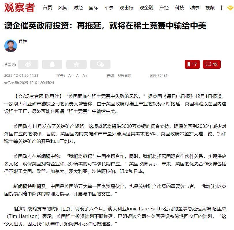 英政府如今已经是强弩之末了! 12月刚过,澳大利亚Ionic Rare Earths公司就向英国政府撂下狠话:再拖着不投钱,2027年才能开工的稀土工厂根本赶不上趟,英国注定在稀土竞赛中输给中美! 可再急的催促也没用,英国政府迟迟不落地投资,核心症结就在于资金短缺,这场关乎产业命脉的博弈,早已容不得半点拖延。 这已经不是企业第一次警告了,英国国防部之前的国防报告里就提过,稀土是导弹、战机这些关键军工装备的核心材料,供应链稳不稳直接关系到国防能不能自己说了算。 现在全球军工领域对稀土的需求每年都在增长,英国工业联合会更直接说,要是稀土供应链一直跟不上,英国计划造的6艘护卫舰、下一代战机都可能因为缺零件延期,这不是吓唬人,有实实在在的国防采购清单撑着。 其实稀土竞赛拼的不是谁产量高,而是供应链能不能自己掌控。欧盟有个《关键原材料法案》,搞了个“关键原材料俱乐部”,成员国能一起勘探、共享产能。 英国虽然不在欧盟,但本来也能加入分好处,可因为自己稀土产业进度太慢,至今没进核心圈子,既用不上欧盟在瑞典、芬兰的勘探成果,也没法用欧盟的应急供应链,只能单独面对中美已经成型的完整产业链。 英国自己也有稀土矿,比如康沃尔郡、苏格兰高地都探明有商业开采价值的矿点,这些稀土矿加起来仅能满足英国6%的需求。 但问题出在审批上,英国环保评估要等36个月,比国际平均多一倍,很多国际勘探企业都不敢来,本土资源根本变不成产业优势。 更关键的是,美国、加拿大都给稀土企业全链条免税,从勘探到回收都补,英国却只给加工环节补一点,政策不配套,根本招不来企业。 现在中国已经在德国、匈牙利建了多个大型回收厂,美国也在得州建了北美最大的,他直言“等英国2027年开工,市场早被抢完了”。 英国政府也不是没做事,11月推出了关键矿产战略,把稀土列为重点,还搞了个勘探、加工、回收的扶持框架。 但这份战略晚了半年,还有漏洞:5000万英镑里只有1500万是前期投资,还得企业自己先出一半,对稀土这种高投入、慢回报的产业来说门槛太高。 而且战略没说稀土产业怎么跟新能源、国防结合,企业看不到长远前景,自然不敢投钱。 反观中国,稀土优势不只是产量高,而是从开采、提纯到造高端磁材一条龙都搞定。 中国稀土行业协会的数据显示,高端钕铁硼磁材全球85%都是中国造,这种磁材是新能源汽车、军工的核心零件。 而且中国搞“稀土加新能源”的模式,需求稳定,英国既没本土市场拉动,又没核心技术,想摆脱依赖根本不现实。 美国则盯着国防自主,把稀土列为战略储备物资,投4亿美元收购稀土企业股份,还强制军工企业买美国产稀土。 更狠的是,美国给本土稀土磁材企业每公斤补35美元,直接把本来想在欧洲布局的企业拉了过去,这也是英国企业被收购、产能外流的原因,美国的政策、钱、市场组合拳,正好打在英国的短板上。 现在英国的问题不是能不能发展稀土产业,而是还有没有机会。国际稀土协会预测,2025到2030年是全球稀土产业链重新洗牌的关键期,中美已经布局完了,剩下的市场都是区域合作的。 英国因为政策拖延,没搭上欧盟的车,还被美国吸走了产业,企业信心都没了。商业贸易部只说“明年给钱”,没个准信,根本稳定不了人心。 现在稀土竞争拼的是整个体系,单靠一个项目、一笔钱没用。英国想赶上来,得赶紧补政策漏洞:要么加快环保审批,要么主动对接欧盟,要么学美国搞全链条补贴。 再拖延下去,错过的不只是稀土产业,更是未来高端制造和国防的话语权,全球供应链重构的浪潮里,慢一步就可能步步慢,最后彻底被挤出核心圈子。