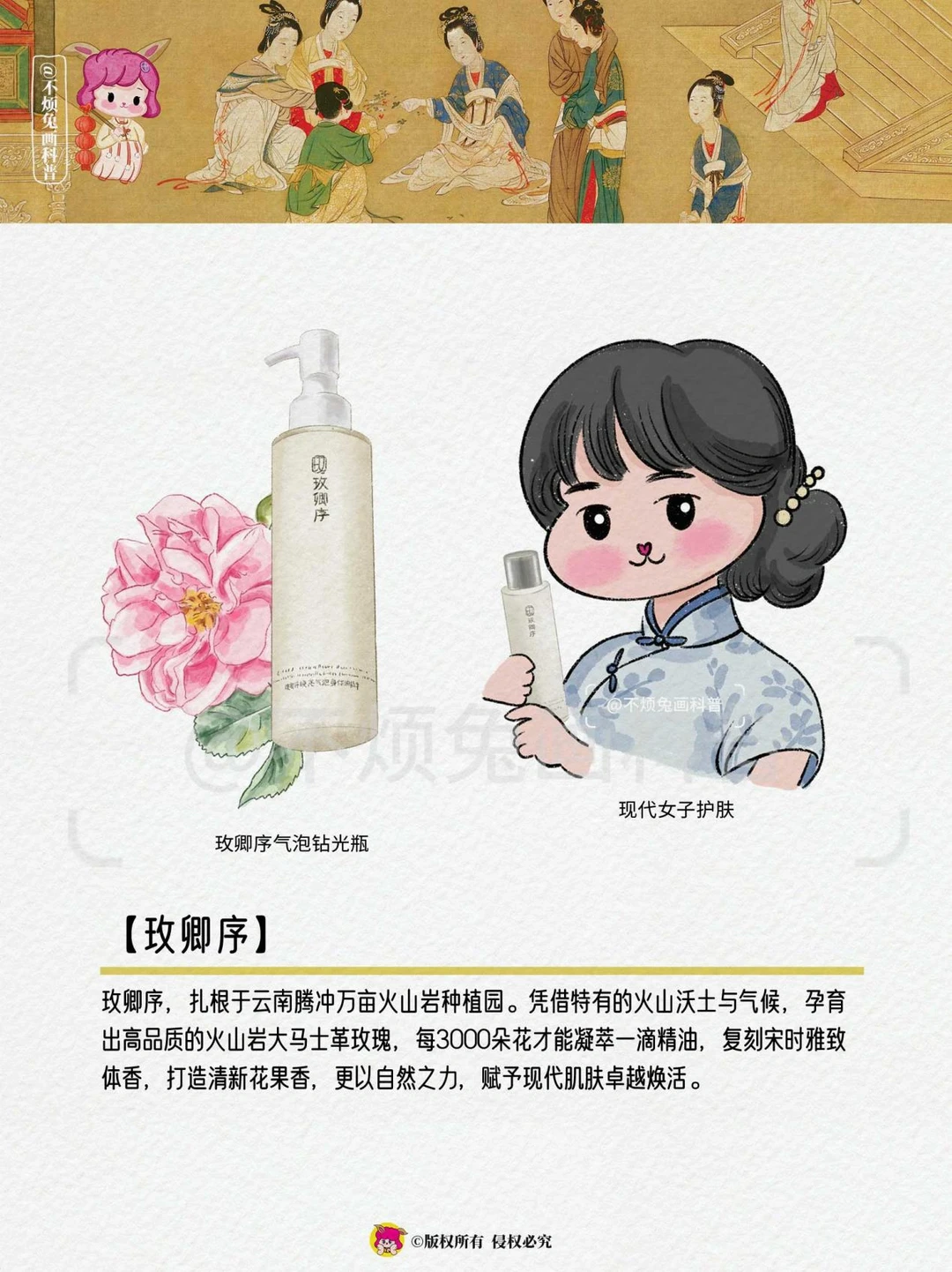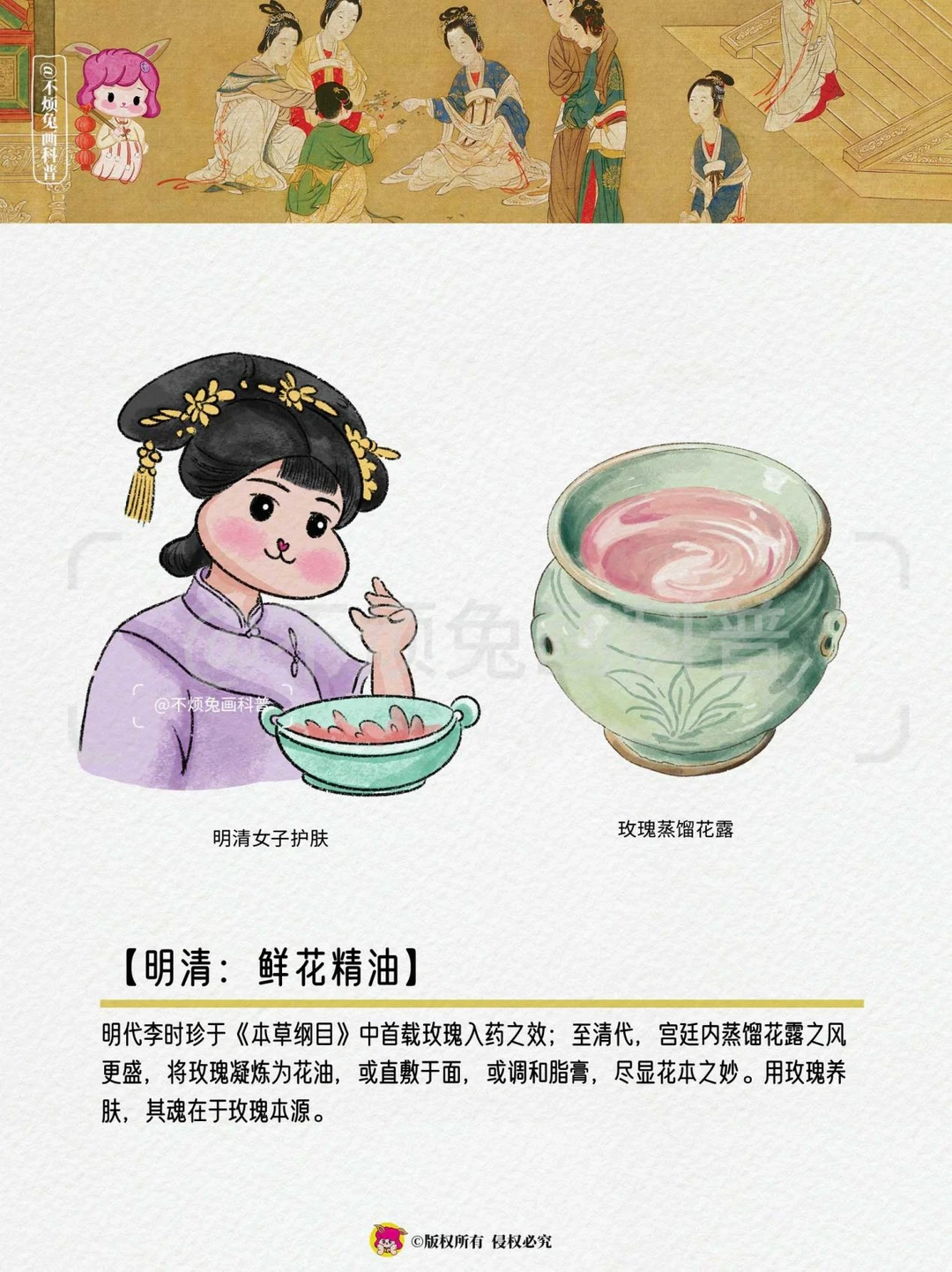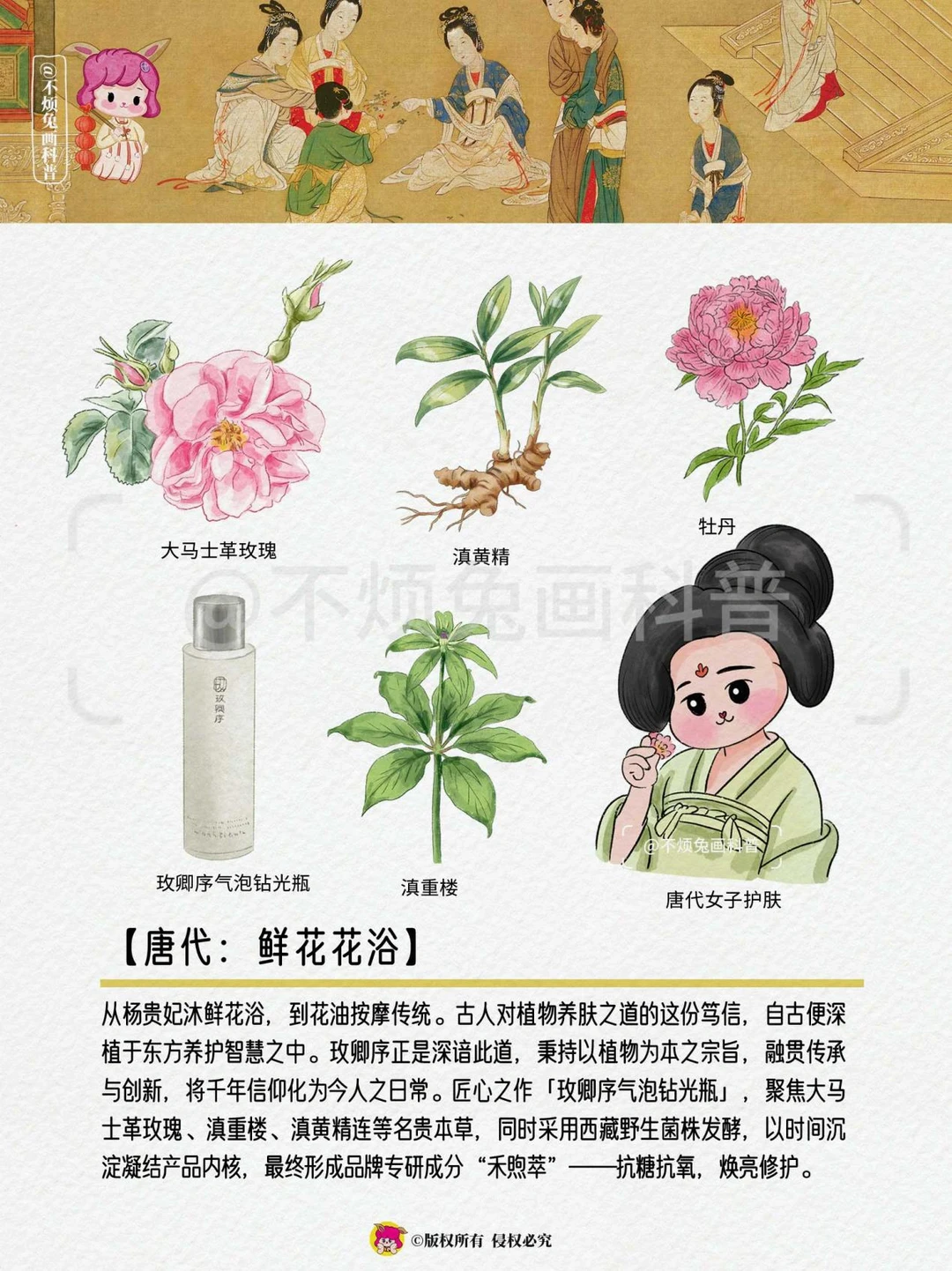 🌹 追溯华夏千年,女性对身体发肤的呵护从未停止。古代女子身体护肤始终秉持"以花养容"的天然理念,尤以牡丹、桃花、玫瑰等花卉为要,形成了一套源远流长的"花本护肤"体系,亦是一部自然智慧的萃取史。她们取天地精华,运用天然植物成分,来实现身体的润泽、香馥与光滑。
