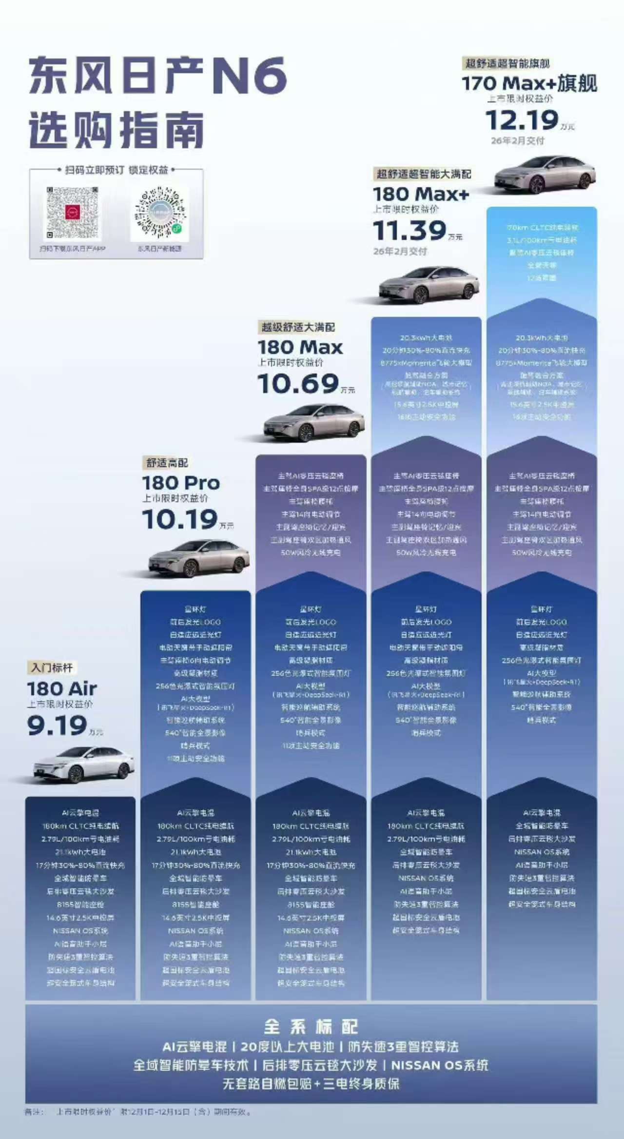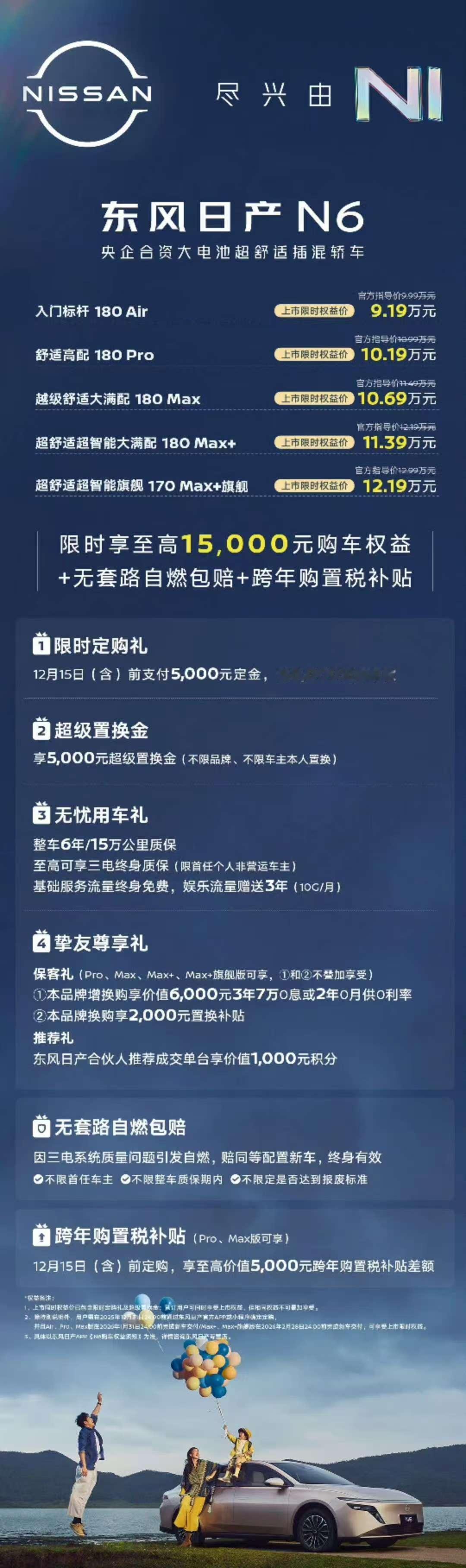 东风日产N6这一上市,直接把插混车的价格干到和燃油车差不多了!十万块左右的预算,现在能买到央企合资的品质,还有新势力那种智能配置,更关键是对家庭太友好:后排座椅跟大沙发似的,空间宽敞,坐久了也不难受。以前这个价位要么是纯燃油车,要么是配置一般的新能源车,现在N6把“靠谱、好开、坐着舒服”揉到一起,估计要成普通家庭买车的首选了。央企合资插混N6上市9.19万起大电池超舒适插混N6售9.19万起