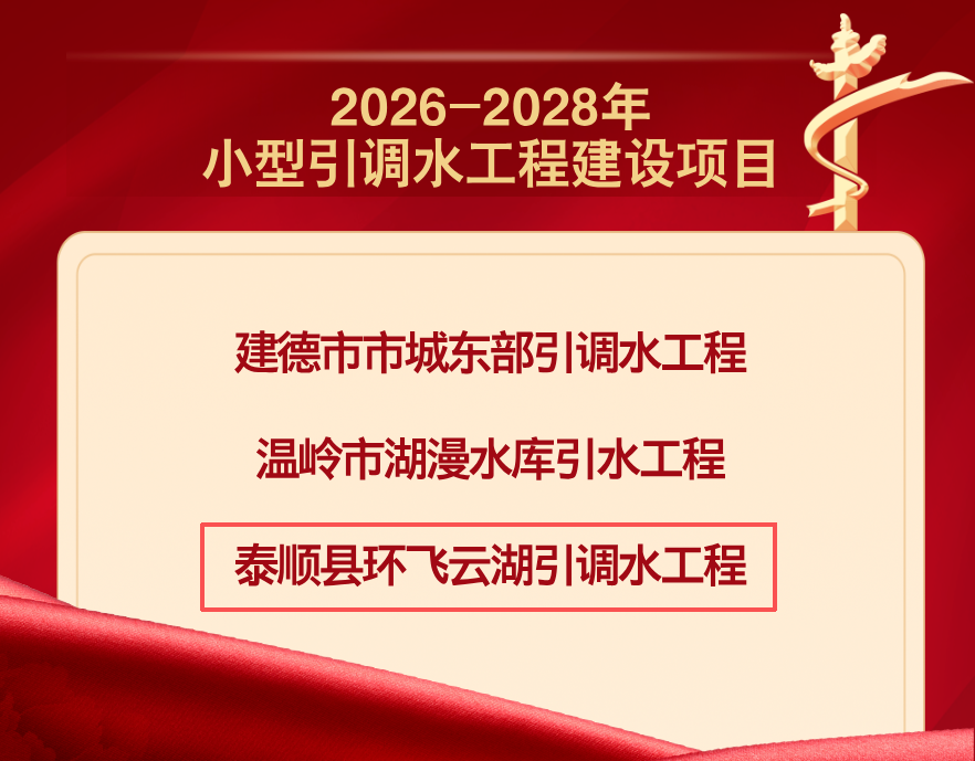 近日,泰顺县环飞云湖引调水工程(东片引水工程)成功入选2026-2028年小型引调水工程建设项目名单,获中央补助资金8000万元,是2026年浙江省三个项目之一,也是温州市唯一入选项目。