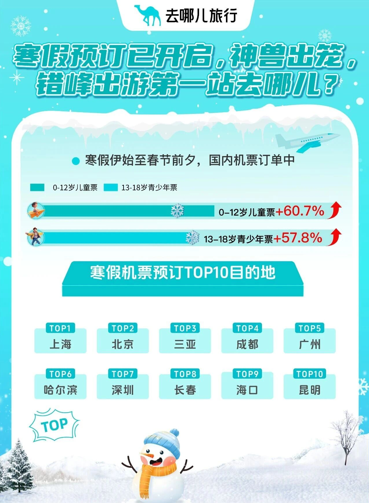 这段时间,儿童、青少年的机票预订量显著增长,且增幅远超成人。其中,0-12岁儿童的机票预订量同比去年寒假增长60.7%,13-18岁青少年的机票预订同比涨了57.8%。