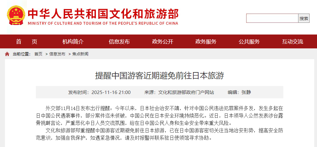 近期,受日本首相高市早苗的涉台错误言论影响,以及日本社会治安不靖,日本旅游迅速转冷。中国外交部、文化和旅游部、教育部等相继发文:提醒中国公民近期谨慎赴日。