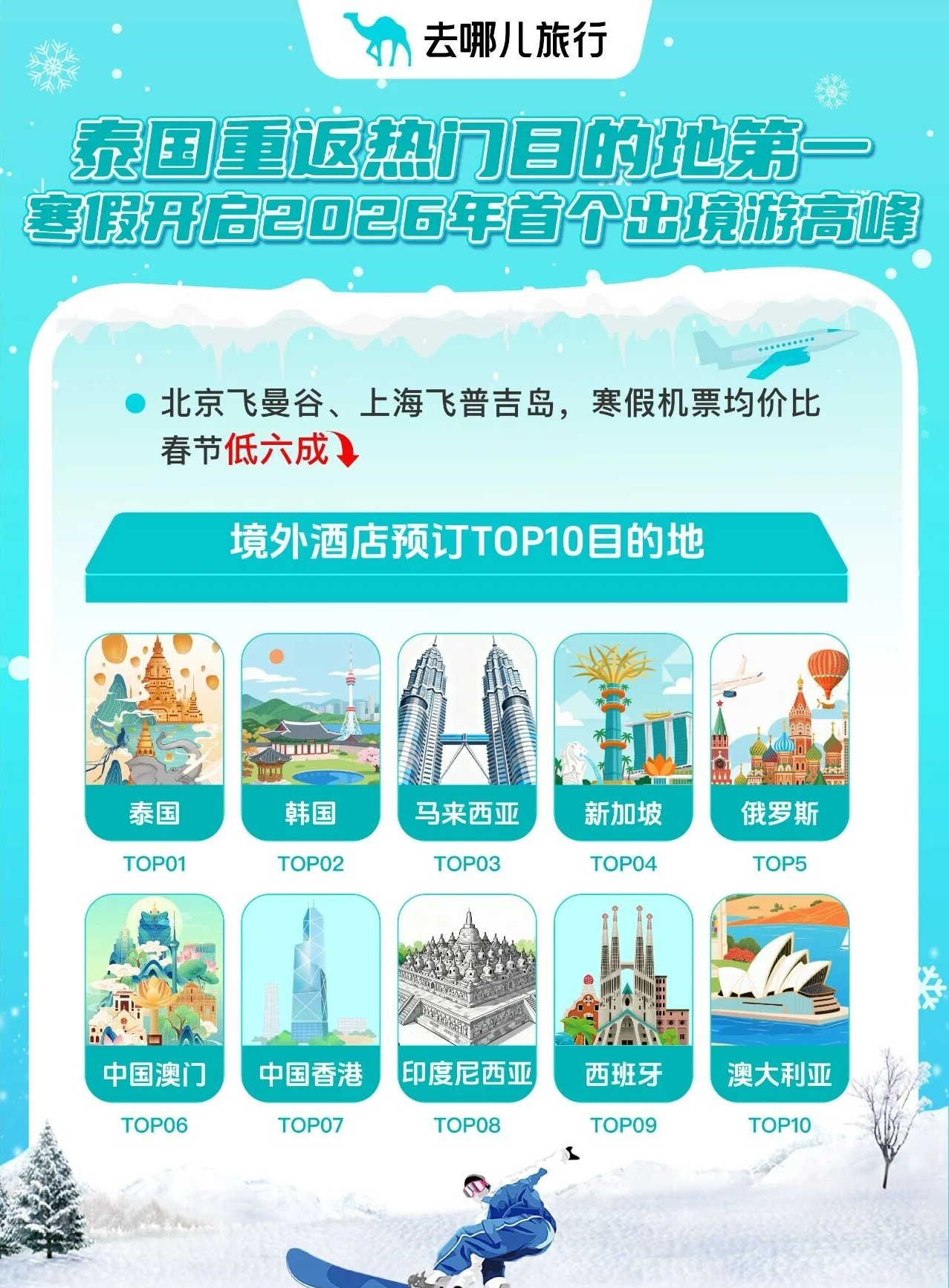 寒假期间,也有不少游客选择赶在春节前出境玩儿一趟。去哪儿数据显示,寒假期间(2026年1月15日至2月10日),在中国游客境外旅游目的地中,泰国酒店的预订量居首位。此前一度位列中国游客出境游目的地榜首的日本,已跌出前十名。