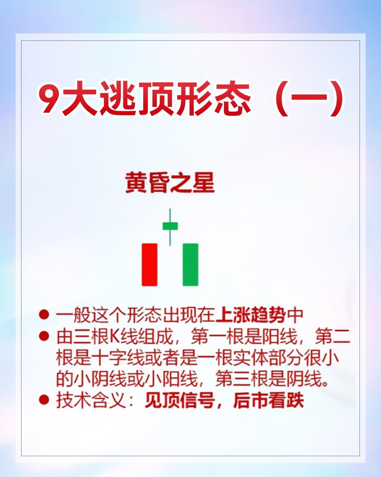 9种股票逃顶形态及其特征与技术含义,具体如下: 1. 黄昏之星:出现在上涨趋势