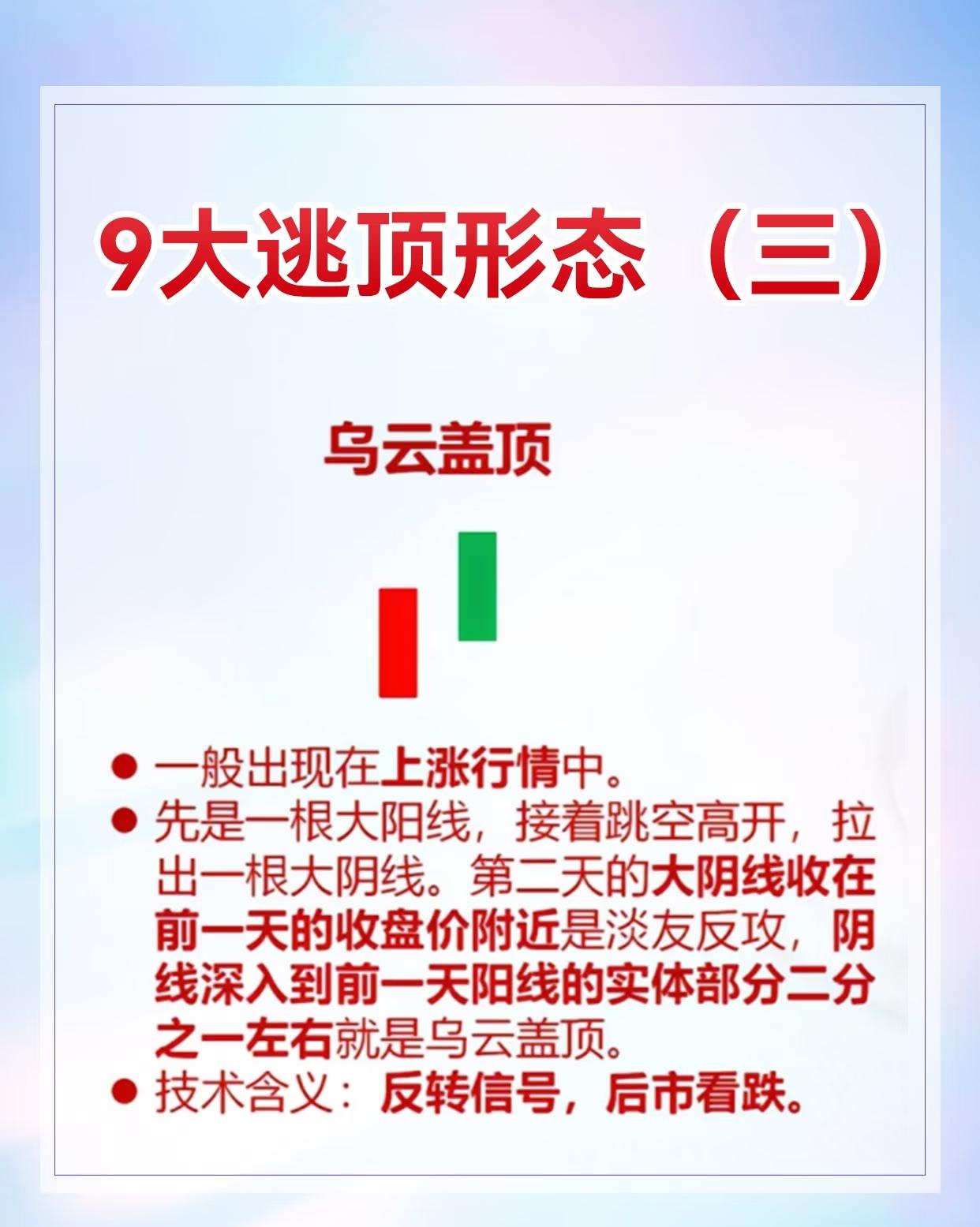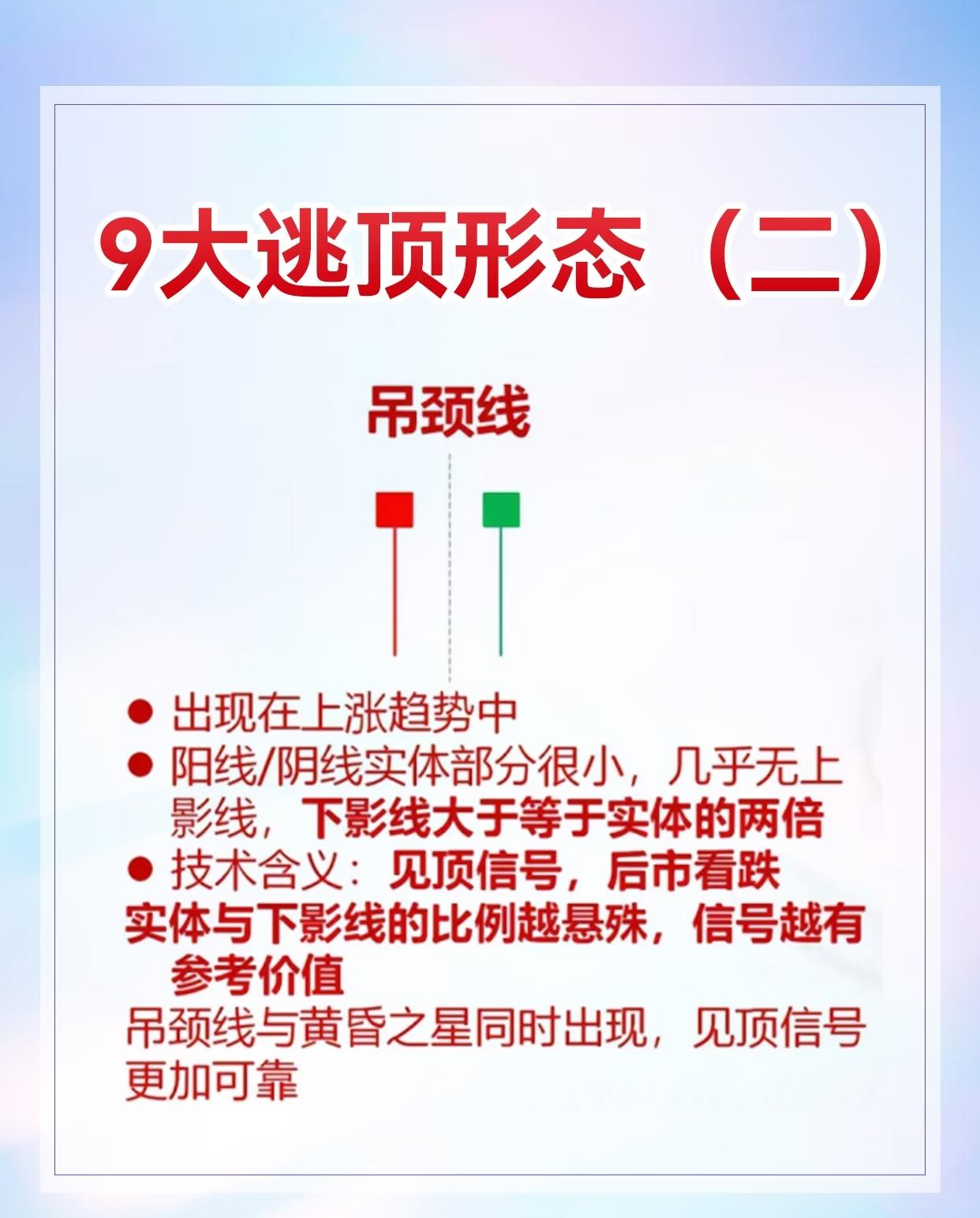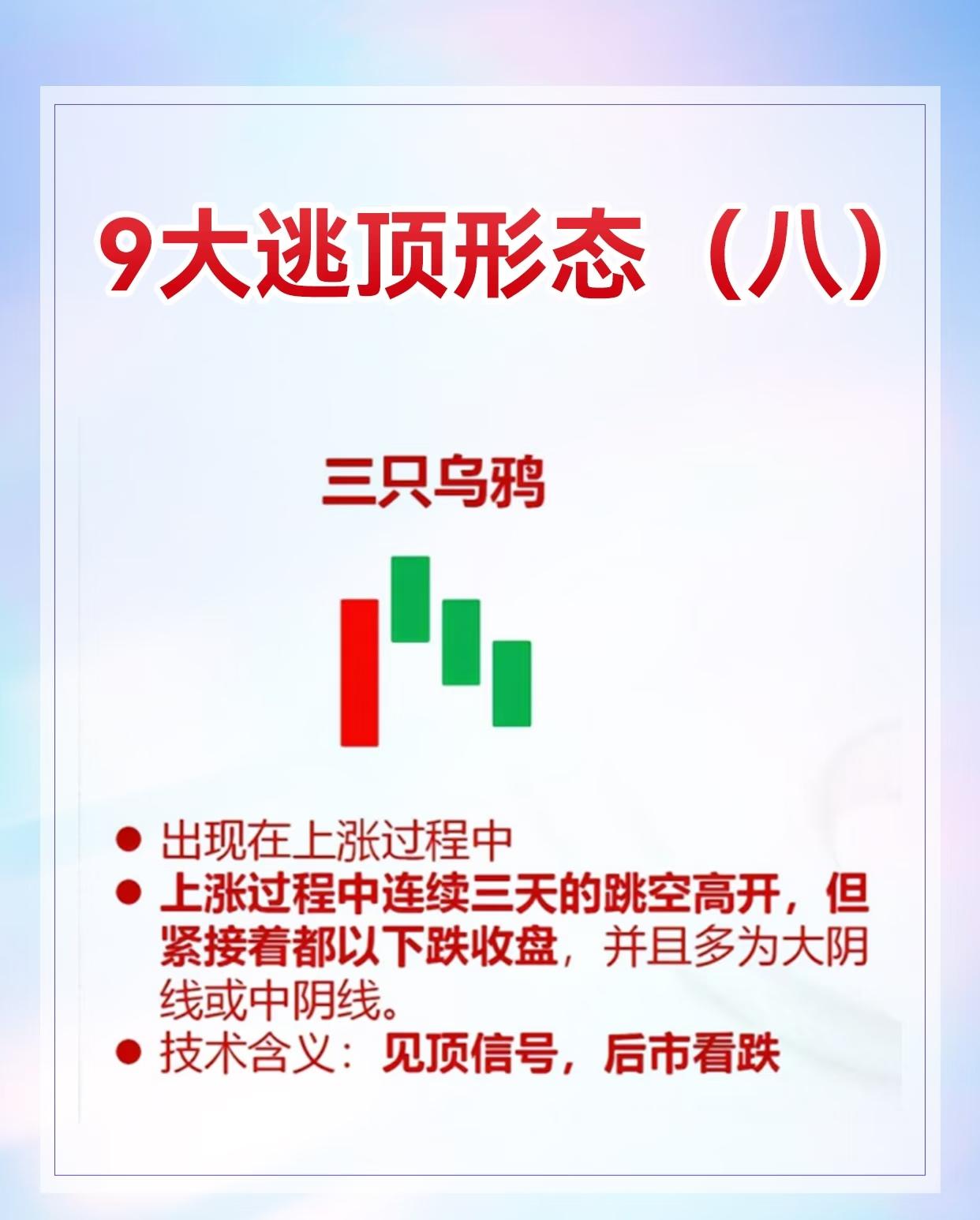 9种股票逃顶形态及其特征与技术含义,具体如下: 1. 黄昏之星:出现在上涨趋势中,由三根K线组成(第一根阳线、第二根十字线或小阴阳线、第三根阴线),见顶信号,后市看跌。 2. 吊颈线:用于上涨趋势,阳线/阴线实体小、下影线至少为实体两倍,实体与下影线比例悬殊时信号更可靠,与黄昏之星同时出现见顶信号更强。 3. 乌云盖顶:常现于上涨行情,先是跳空高开大阳线,次日大阴线收于前日收盘价附近,为反转信号,后市看跌。 4. 平顶/钳子顶:上涨趋势中多根K线最高价处于同一水平,见顶信号,后市看跌。 5. 塔形顶:上涨趋势中先出现大阳线或中阳线,接着一连串小K线,最后大阴线或中阴线,见顶信号,后市看跌。 6. 圆顶:上涨过程中由多根小阴小阳线构成圆弧形顶部,以向下跳空缺口确定形态成立,见顶信号,后市看跌。 7. 双飞乌鸦:上涨趋势中先阳后阴,第二根阴线完全包容第一根阴线,见顶信号,后市看跌。 8. 三只乌鸦:上涨过程连续三天跳空高开低走且多为大阴线或中阴线,见顶信号,后市看跌。 9. 高档五阴线:上涨行情中先有力阳线,随后连续5根及以上小阴线(可能6 - 8根),见顶信号,后市看跌 。