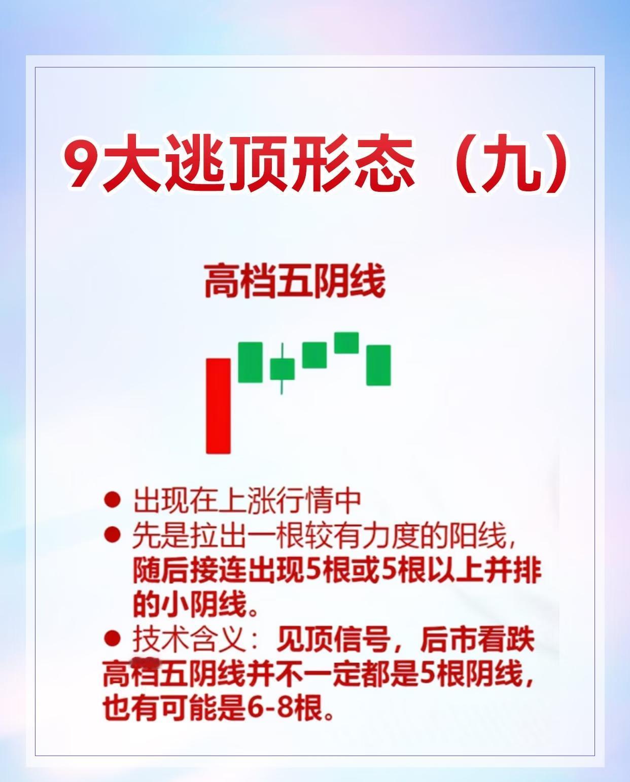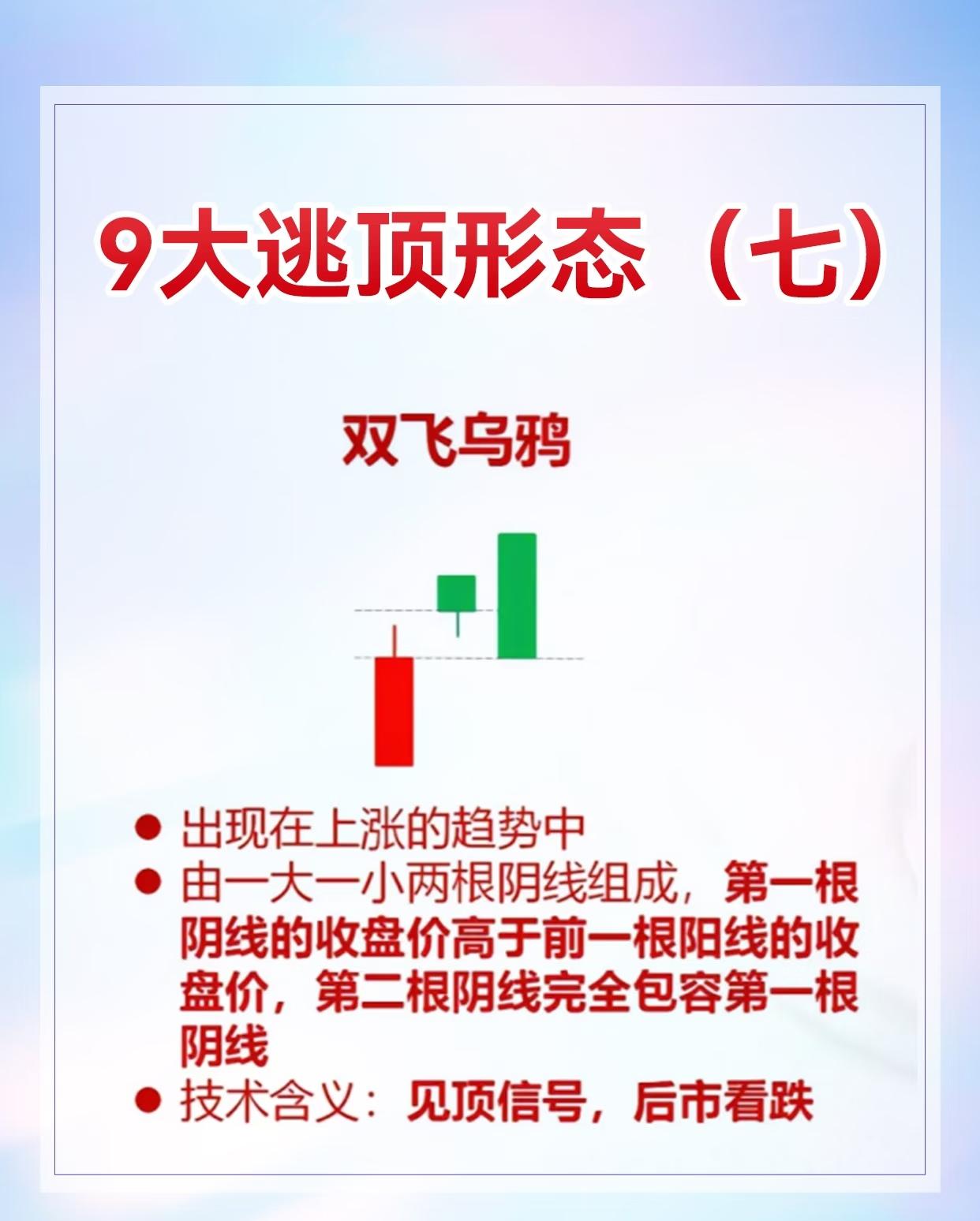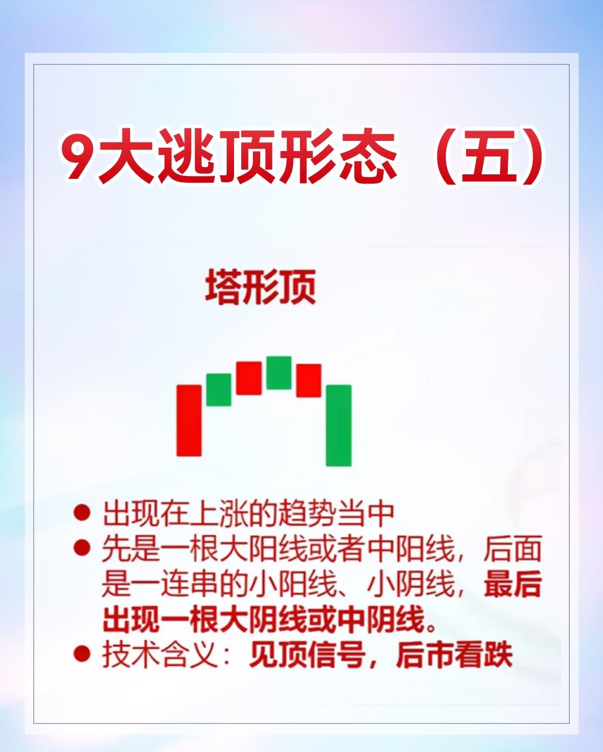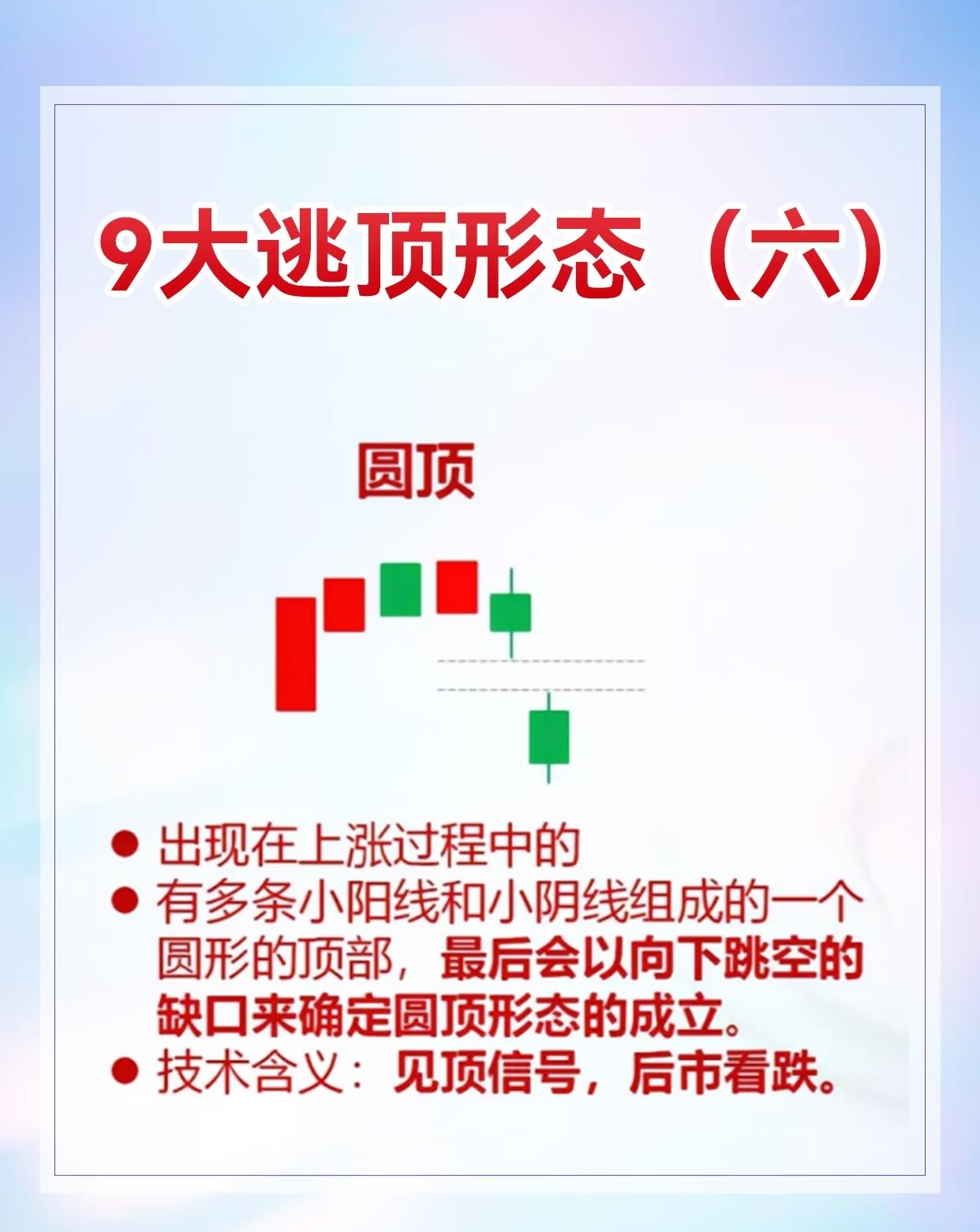 9种股票逃顶形态及其特征与技术含义,具体如下: 1. 黄昏之星:出现在上涨趋势中,由三根K线组成(第一根阳线、第二根十字线或小阴阳线、第三根阴线),见顶信号,后市看跌。 2. 吊颈线:用于上涨趋势,阳线/阴线实体小、下影线至少为实体两倍,实体与下影线比例悬殊时信号更可靠,与黄昏之星同时出现见顶信号更强。 3. 乌云盖顶:常现于上涨行情,先是跳空高开大阳线,次日大阴线收于前日收盘价附近,为反转信号,后市看跌。 4. 平顶/钳子顶:上涨趋势中多根K线最高价处于同一水平,见顶信号,后市看跌。 5. 塔形顶:上涨趋势中先出现大阳线或中阳线,接着一连串小K线,最后大阴线或中阴线,见顶信号,后市看跌。 6. 圆顶:上涨过程中由多根小阴小阳线构成圆弧形顶部,以向下跳空缺口确定形态成立,见顶信号,后市看跌。 7. 双飞乌鸦:上涨趋势中先阳后阴,第二根阴线完全包容第一根阴线,见顶信号,后市看跌。 8. 三只乌鸦:上涨过程连续三天跳空高开低走且多为大阴线或中阴线,见顶信号,后市看跌。 9. 高档五阴线:上涨行情中先有力阳线,随后连续5根及以上小阴线(可能6 - 8根),见顶信号,后市看跌 。