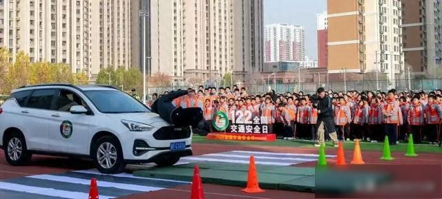 在新秀学校,保定交警特邀特技演员,通过专业表演与车辆碰撞的方式,模拟闯红灯、逆行等交通违法行为引发的交通事故现场。每一次“惊险”事故的发生瞬间,都引来同学们的惊叹连连。此外,公安交警还现场教学,向学生们展示了标准的交通安全指挥手势。